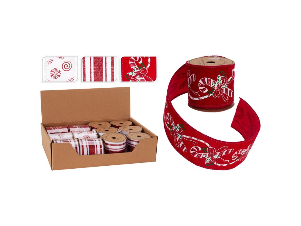 Dekorační stuha 63x2700 mm červená/bílá (mix 3 vzorů, cena /1 ks)