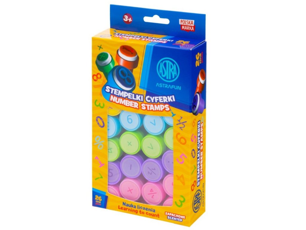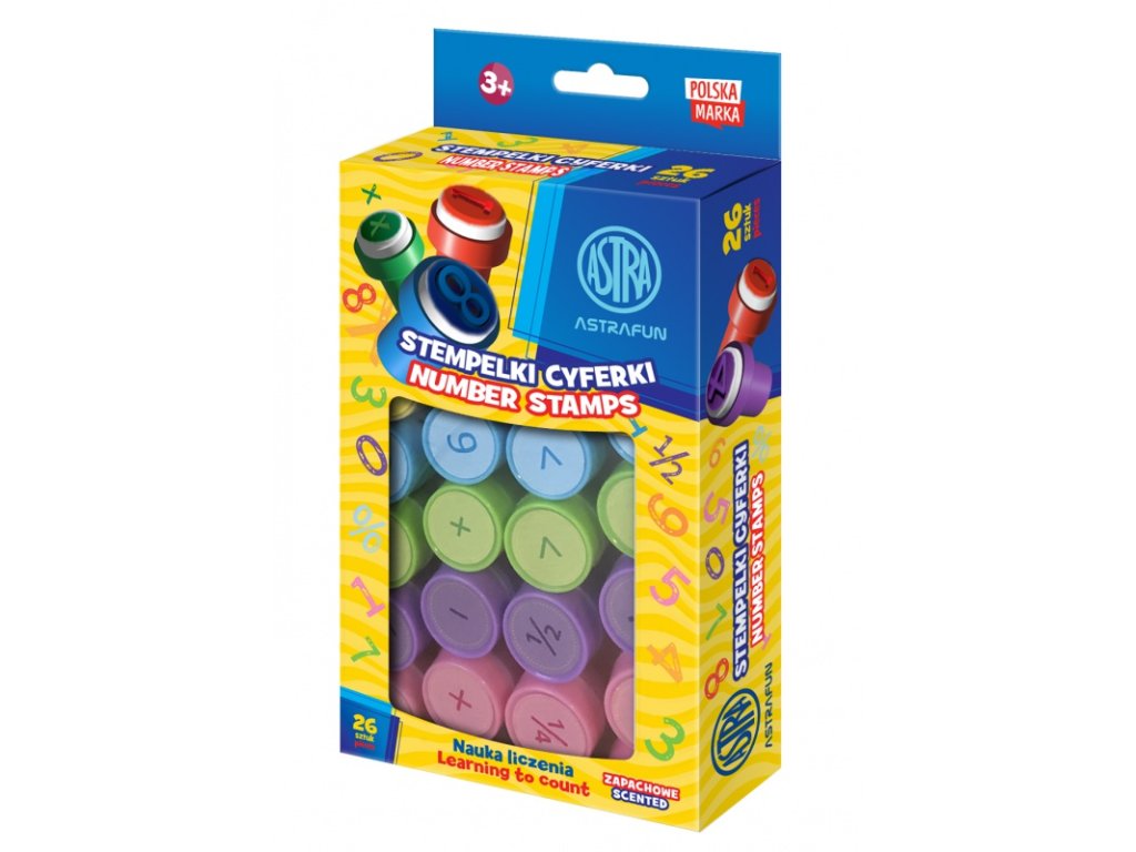 📘 Vzdělávání hrou – sada voňavých razítek AstraFUN Matematika nabízí 26 kusů s čísly a matematickými znaky, které pomáhají dětem poznávat čísla a základy počítání.