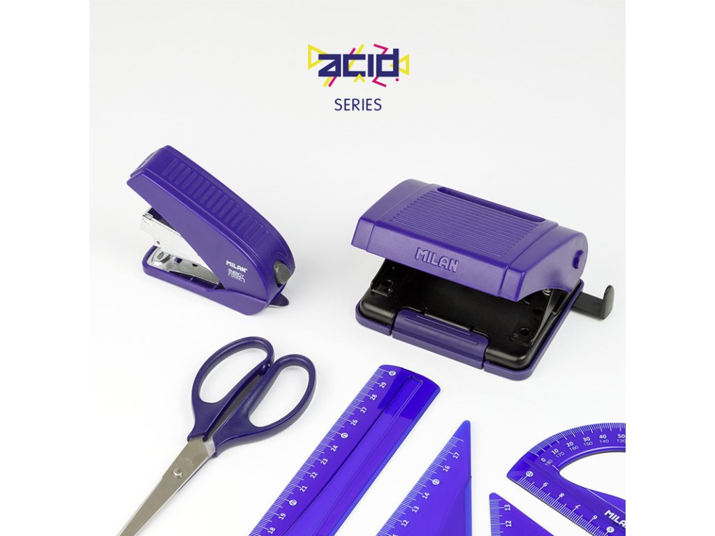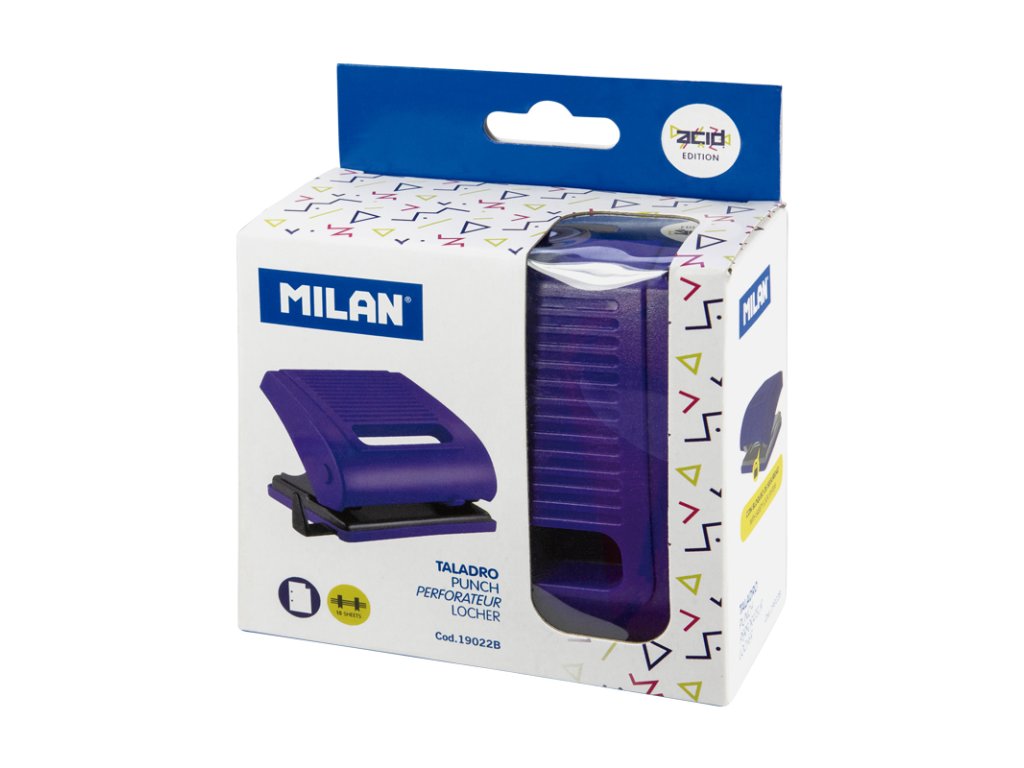 Děrovačka MILAN Acid s odolným plastovým vodítkem, podstavec z měkkého plastu. S bezpečnostním blokovým systémem. Kapacita: 15 listů. Barva: modrá.Doplňkové parametry