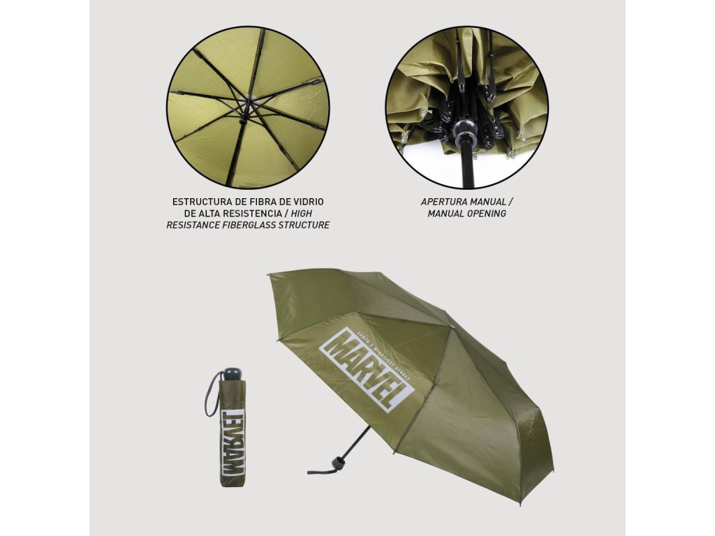 Skládací deštník Marvel. Manuální otvírání. Diagonála 97 cm, poloměr 53 cm,délka složeného stavu 23 cm. Barva: khaki.Výrobce: Cerda.Doplňkové parametry
