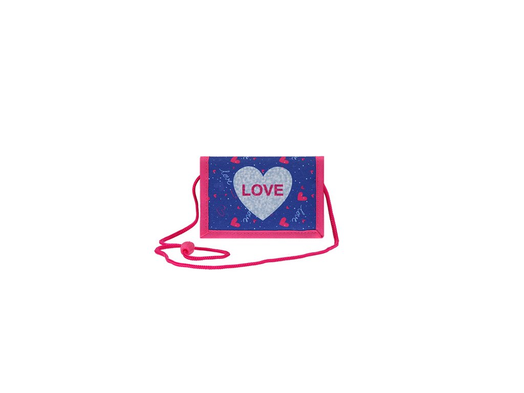 Dětská peněženka se šňůrkou a zapínáním na suchý zip. Vnitřek obsahuje: PVC okénko, kroužek na klíče, 1 vnitřní přihrádku na zip a zasouvací přihrádku, 1 vnější PVC okénko se zapínáním na zip. Rozměry: 12,5 x 8,5 cm (složené) a poutko 40 cm. Materiál: 100% polyester.Doplňkové parametry