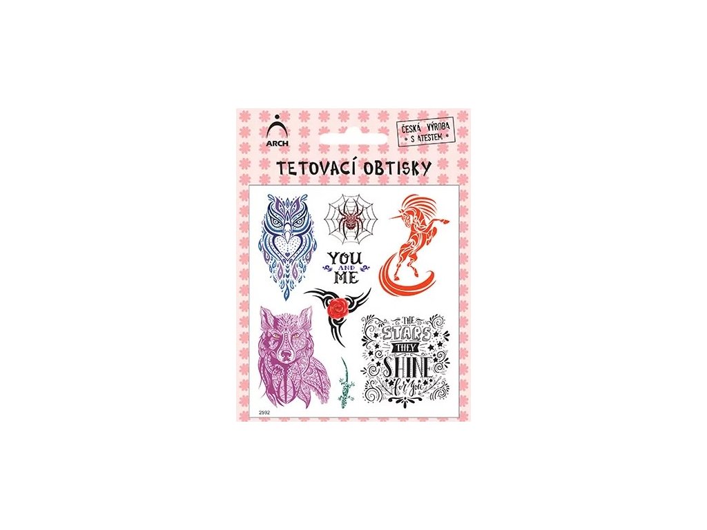 Krásné tetovačky nejen na léto! Tetovací obtisky, které zůstanou na kůži jsou velmi elastické a odolné proti stírání, sprchování, mýdlu i mořské vodě. Vydrží krásné 3 až 5 dní. Tetovačky s obrázky jsou vyrobeny pomocí speciálního systému, který nedráždí kůži a je přenosný vodou. Obsahuje nedráždivé tiskové barvy a speciální lepidlo pro dobrou přilnavost.Doplňkové parametry