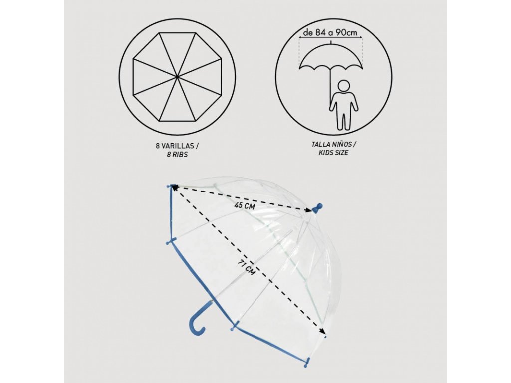 S průměrem 71 cm poskytuje deštník dostatek prostoru pro pohodlné držení a spolehlivou ochranu před deštěm. Lehká plastová rukojeť je navržena tak, aby perfektně sedla do malých rukou vašich dětí.