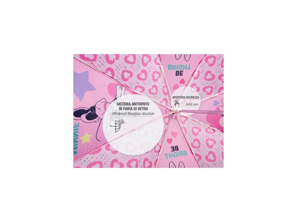 Veselý deštník pro nejmenší s manuálním mechanismem a pohádkovým potiskem MINNIE MOUSE. Deštník má kvalitní a pružnou konstrukci, je větruodolný.• manuální otevírání, bezpečný mechanismus proti přivření prstíků