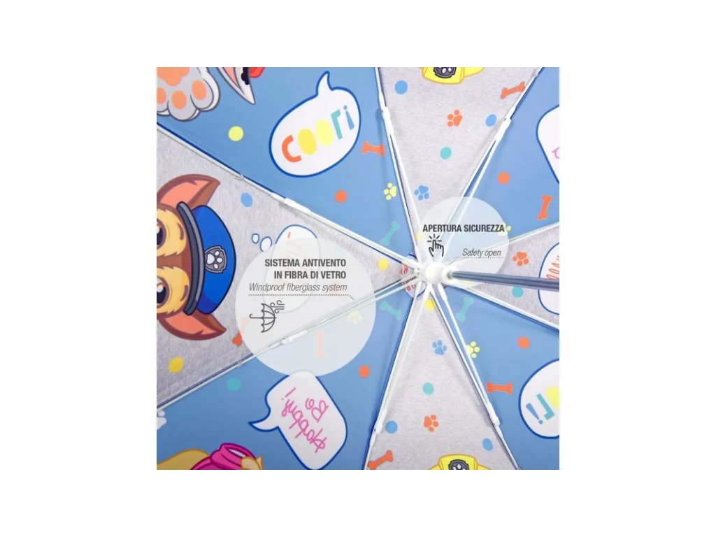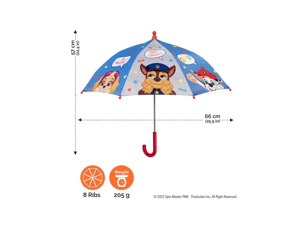 Veselý, neprůhlednutelný a stylový deštník PAW PATROL. Jednoduché a bezpečné otevírání s mechanismem proti přivření prštěků.• manuální otevírání