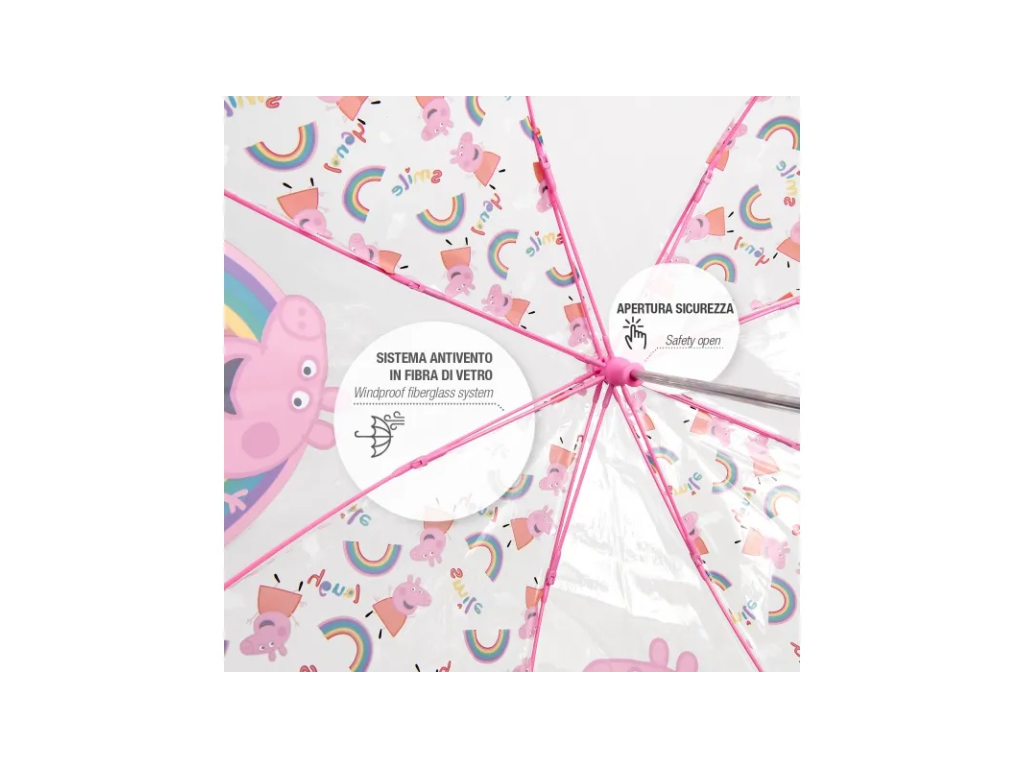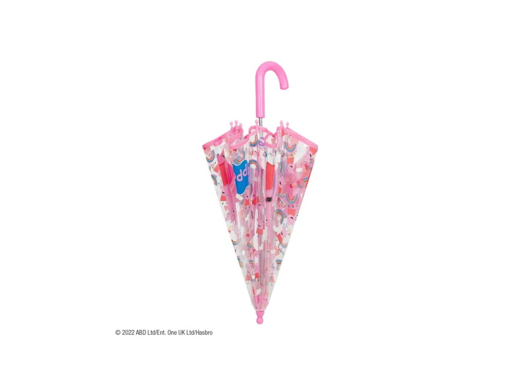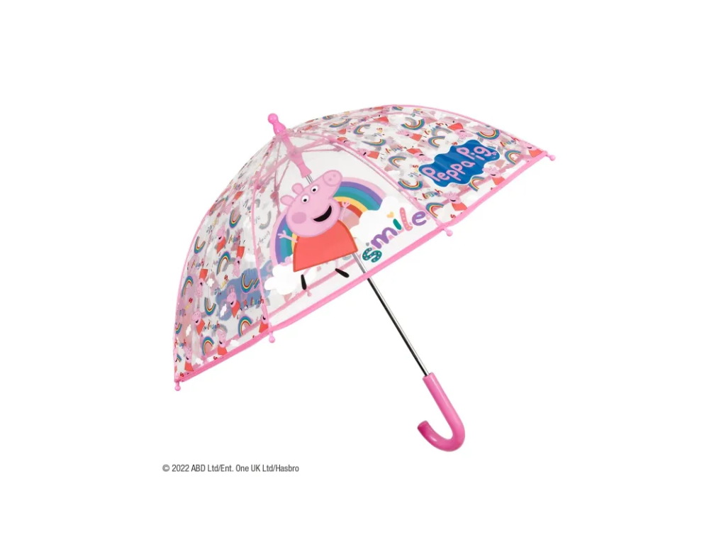 Veselý deštník s mechanickým otevíráním a pohádkovým potiskem PEPPA PIG. Deštník má kvalitní a pružnou konstrukci. Průměr nataženého deštníku je 64cm.• manuální otevírání, bezpečný mechanismus proti přivření prstíků