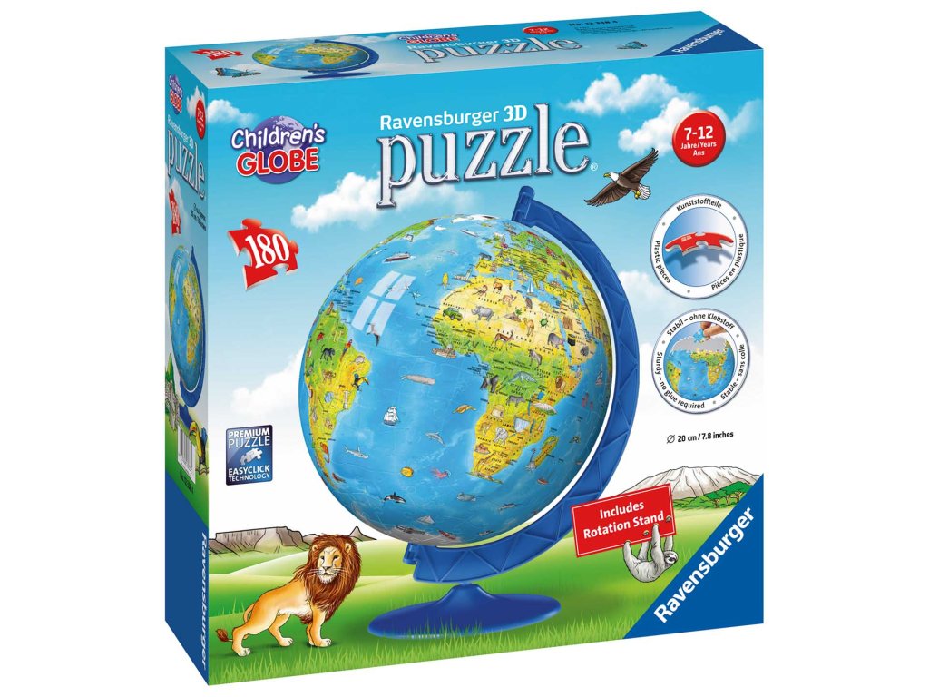 3D Puzzle globus s obrázky z celého světa. V balení jsou puzzle o 180 dílcích. Baleno v krabici. Průměr složeného globu je 20cm. Doporučený věk 7+Doplňkové parametry