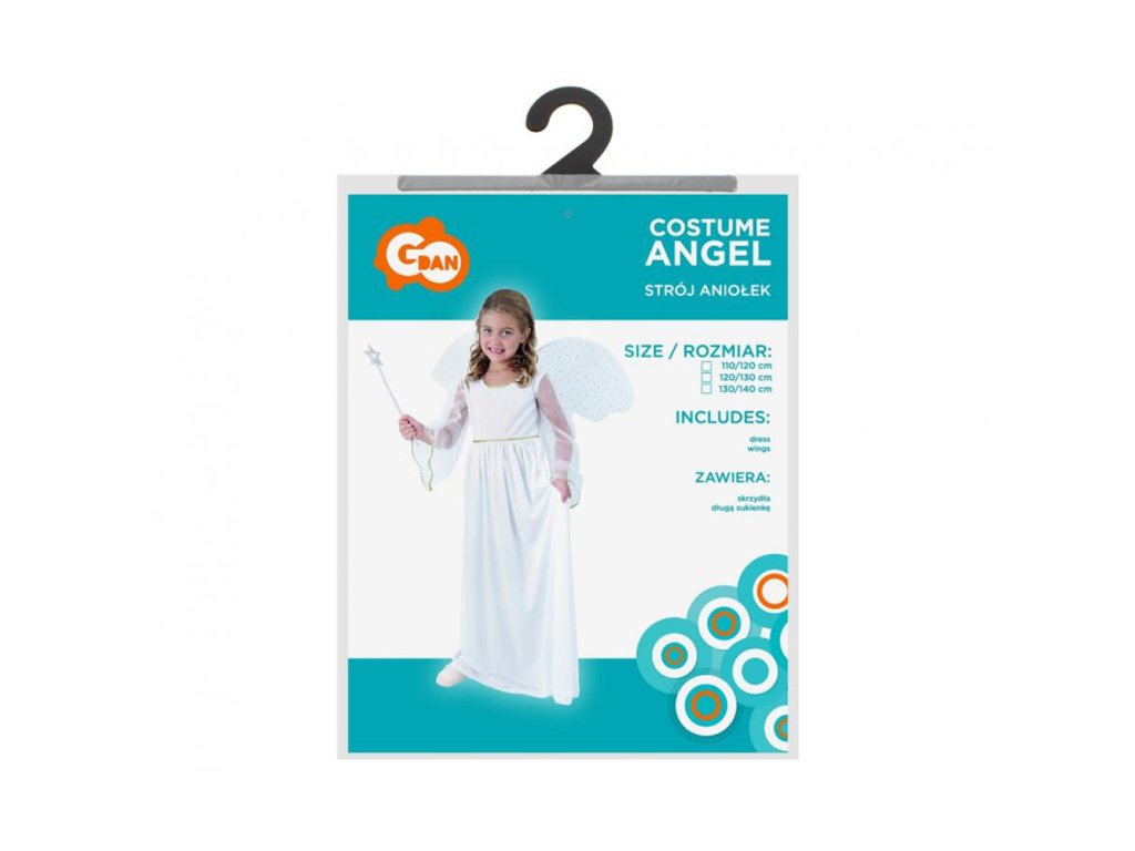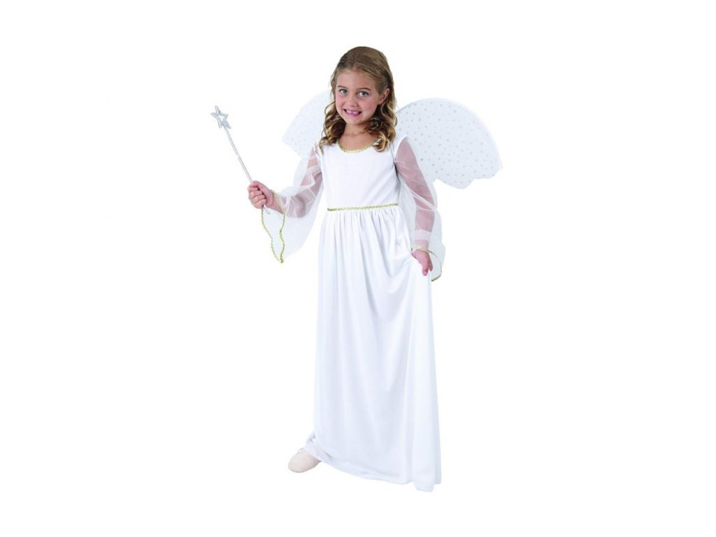 Dívčí šaty anděla určené na karneval. Souprava obsahuje: dlouhé šaty a křídla. Celková délka: 92 cm Šířka v podpaží: 29 cm Šířka v pase: 30 cm Materiál: 100% polyesterDoplňkové parametry