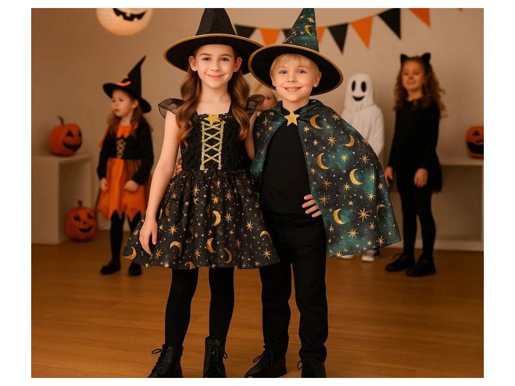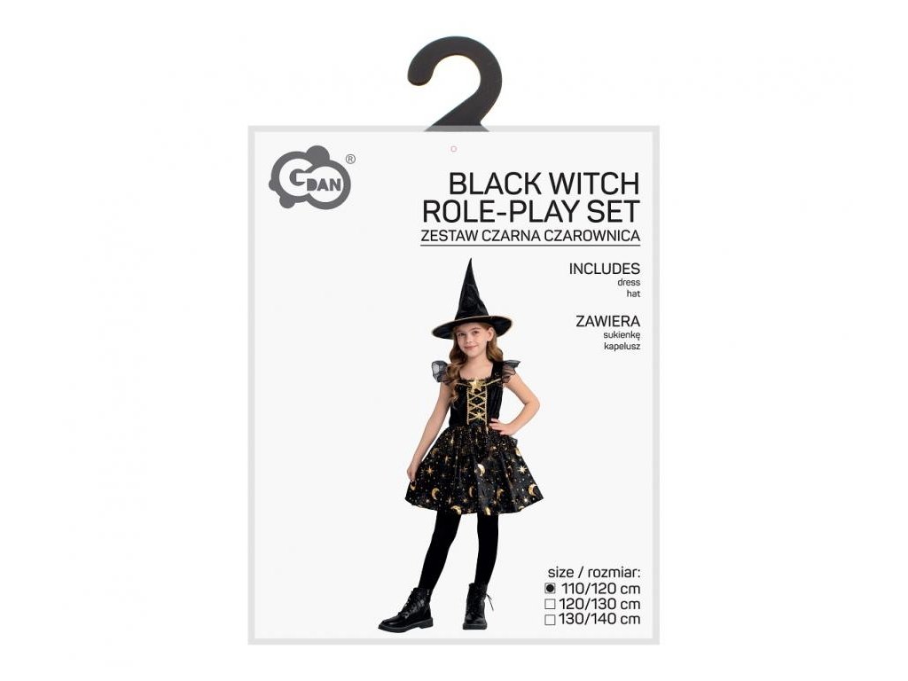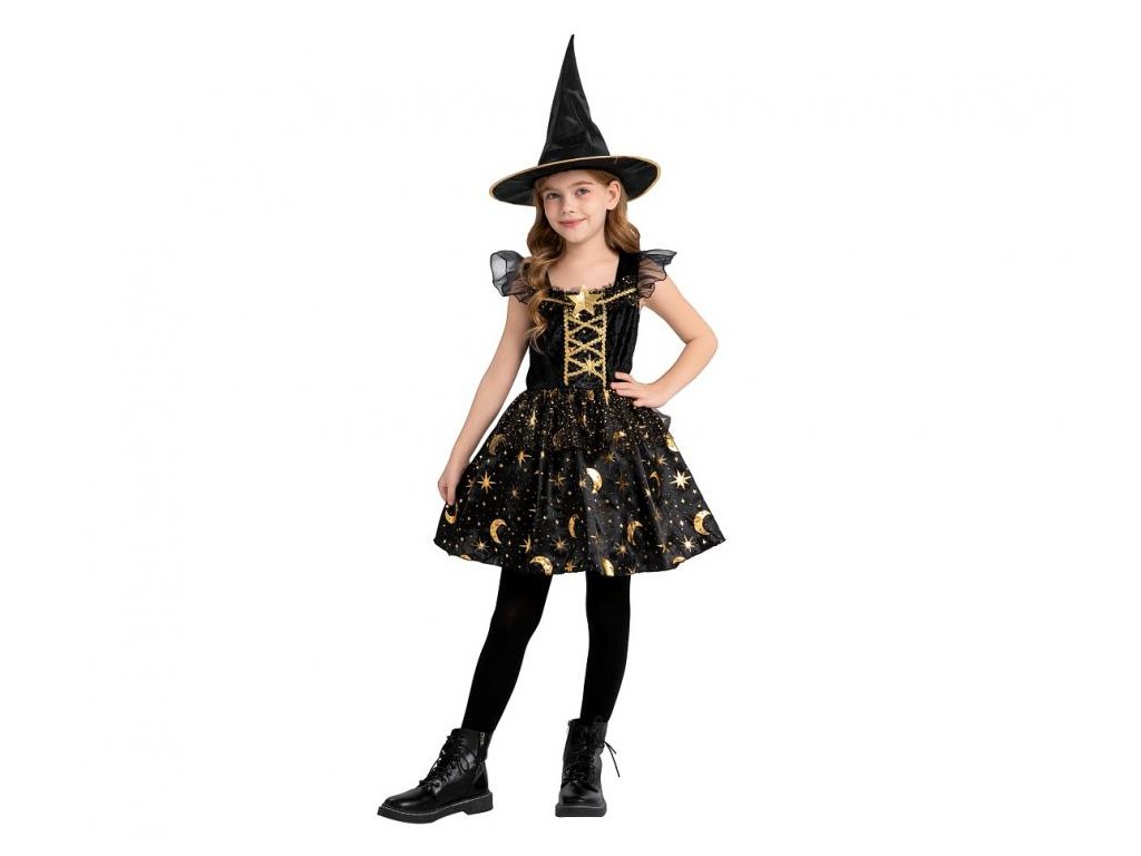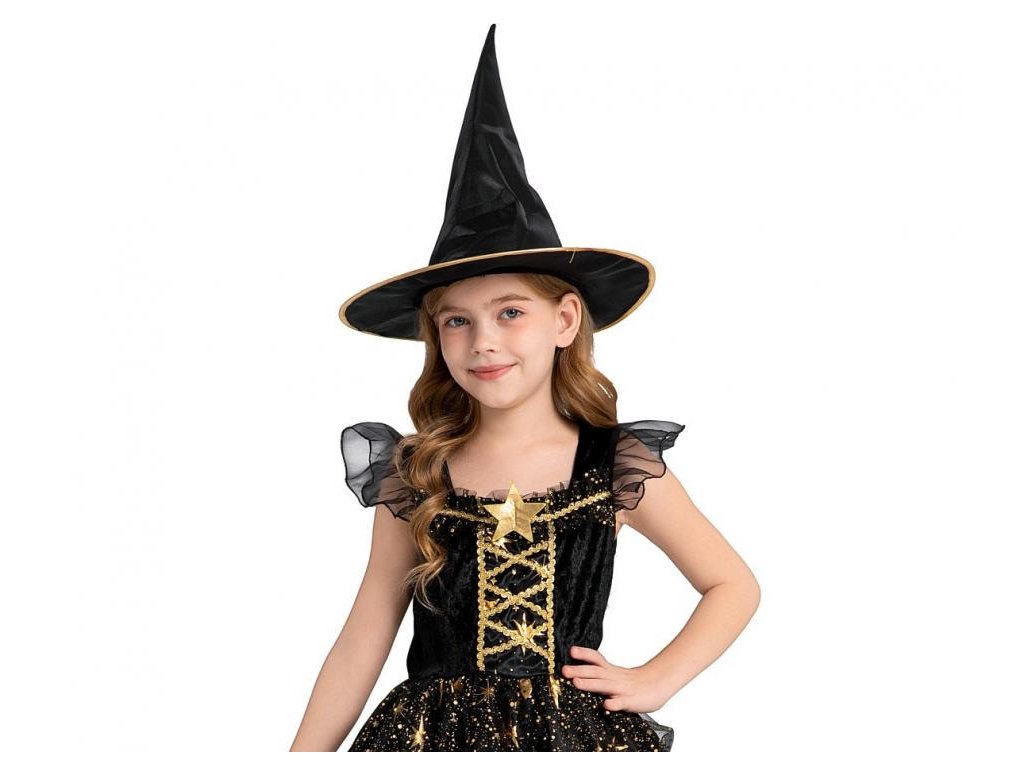 Dětský kostým černé čarodějnice (šaty, klobouk), velikost 110/120 cm