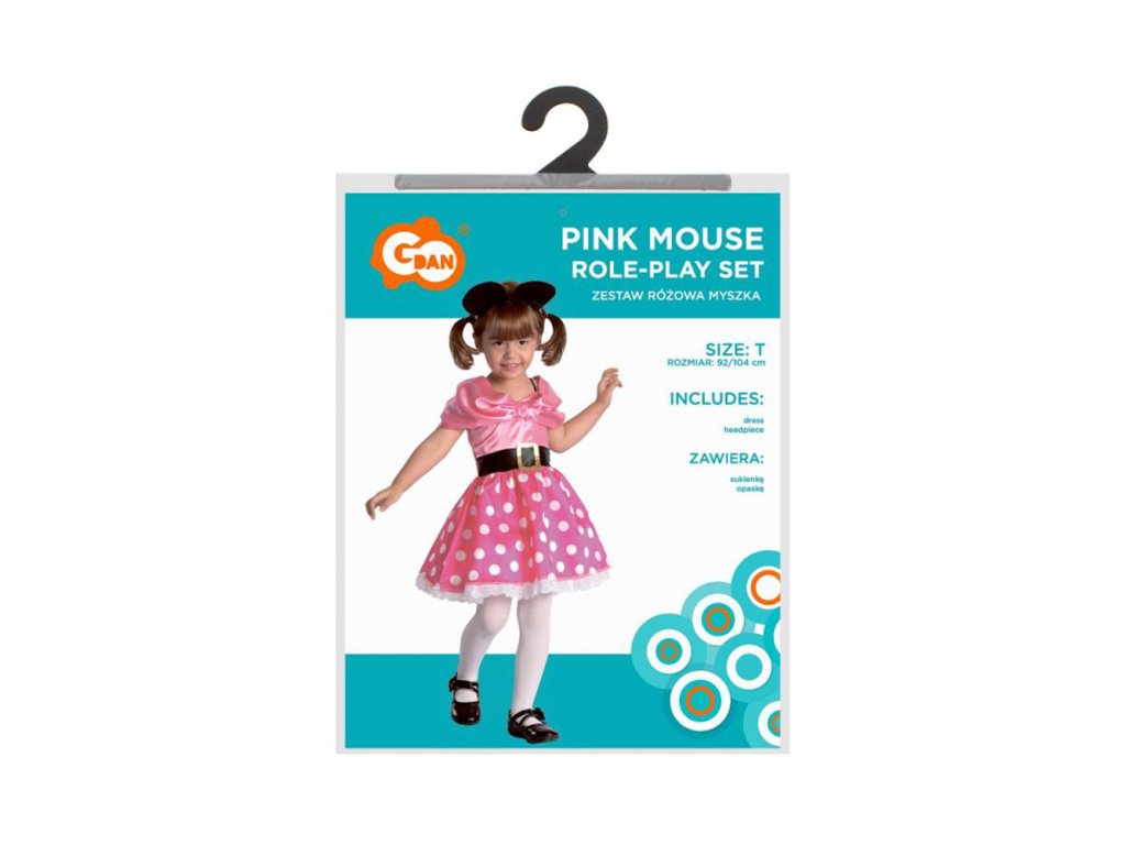 Dětská souprava převleku pro dívku - Růžová myška Balení obsahuje: šaty, čelenku Velikost: 92 / 104 cm Celková délka šatů: cca 58 cm Šířka pod pažemi: cca 30 cm Šířka v pase: cca 24-30 cm (gumička) Materiál: 100% polyesterDoplňkové parametry