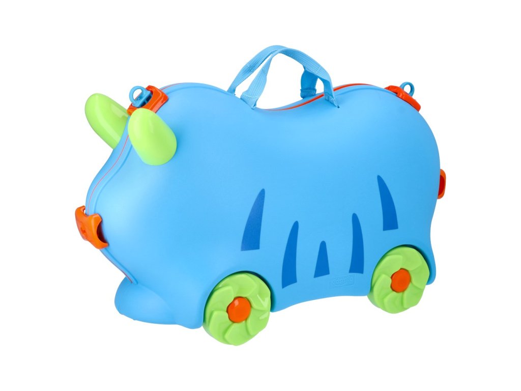 Detský cestovný kufrík s kolieskami možno ťahať, sadnúť si naň a odrážať sa nohami alebo niesť.