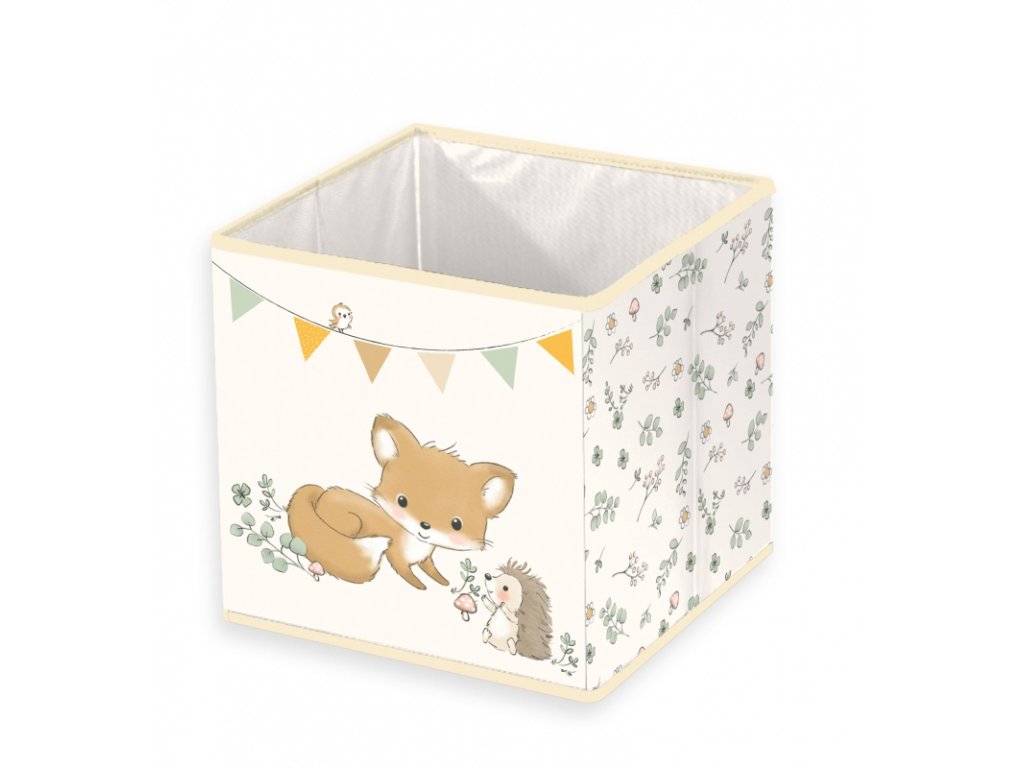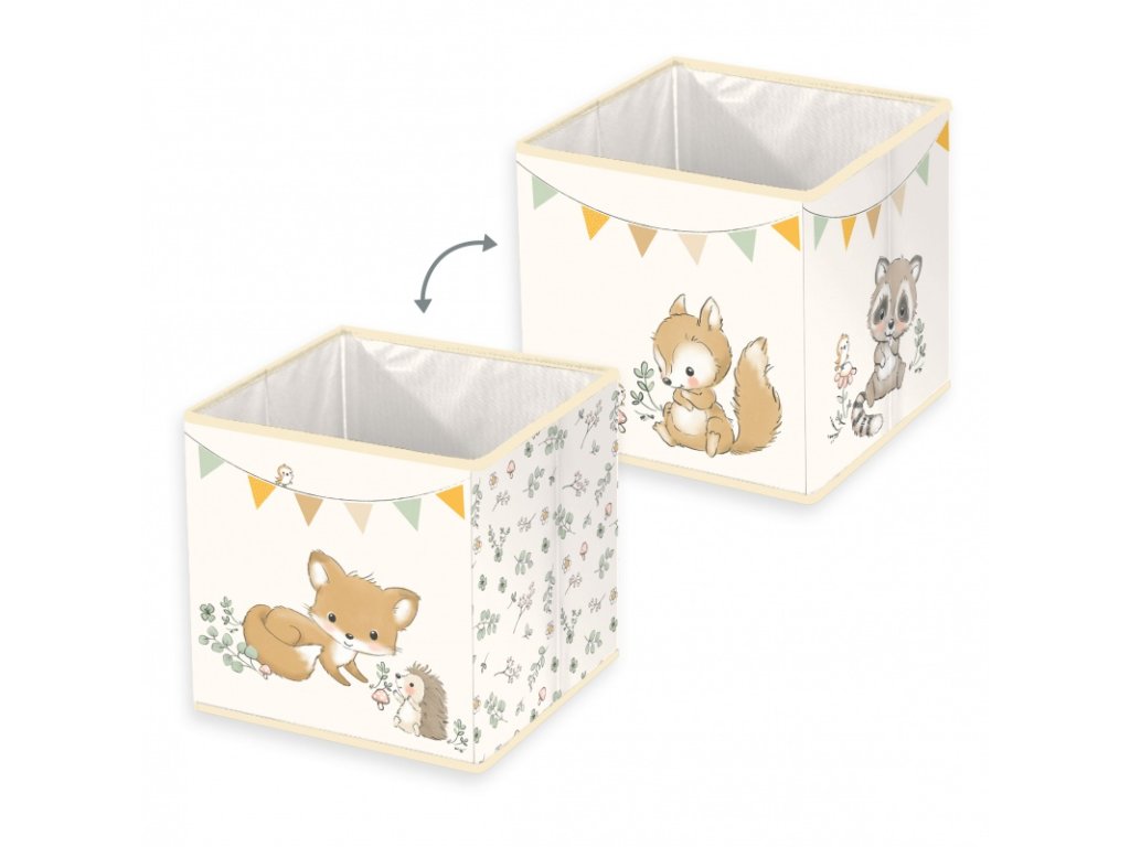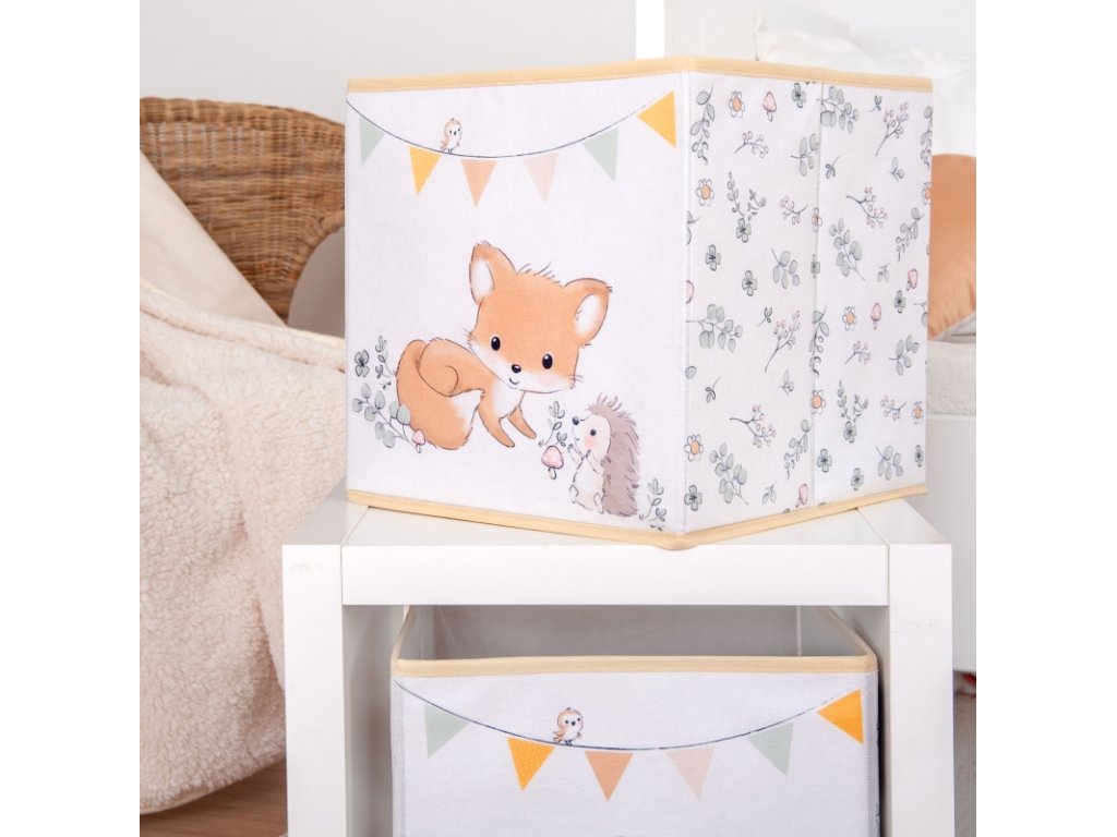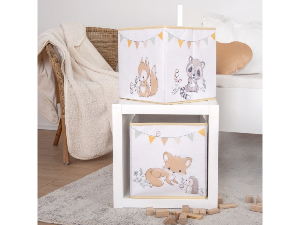 Box zdobí milá zvířátka - zvědavý medvídek, hravá lištička či jemný lesní motiv. Jemné barvy se krásně hodí do dětského koutku a vytvoří útulné prostředí 🌿
