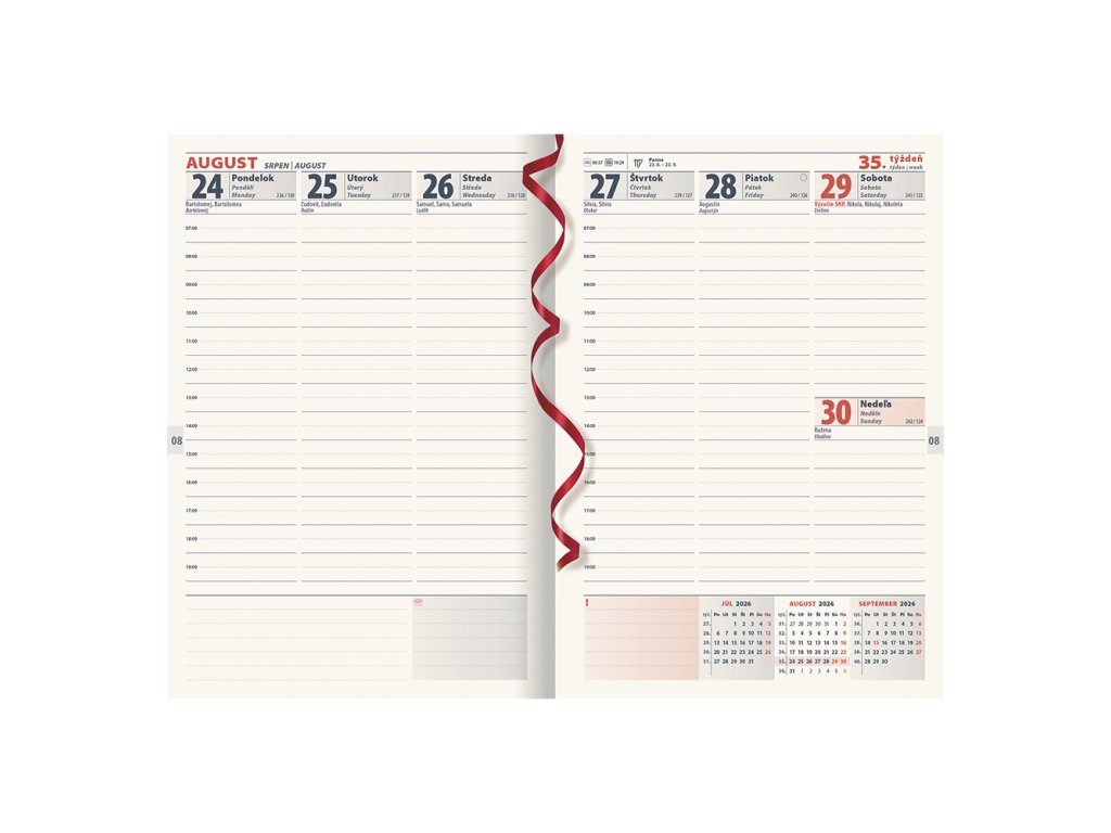 Formát: 165 x 245 mm (B5). Matná obálka s razbou roku. Krémové listy. Tvrdá šitá väzba V8, 128 strán. Cena za 1 ks výrobku. Týždenný manager diár s béžovou matnou obálkou s hodinovým delením. Obsahuje slovenské a české kalendárium, anglický preklad mesiacov a dní, informácie o štátnych sviatkoch susediacich krajín EÚ, prehľadný a plánovací kalendár, školské prázdniny, prehľad dôležitých inštitúcií, adresár. Ponúka dostatočný priestor pre písanie poznámok a pripomienok.Doplňkové parametry