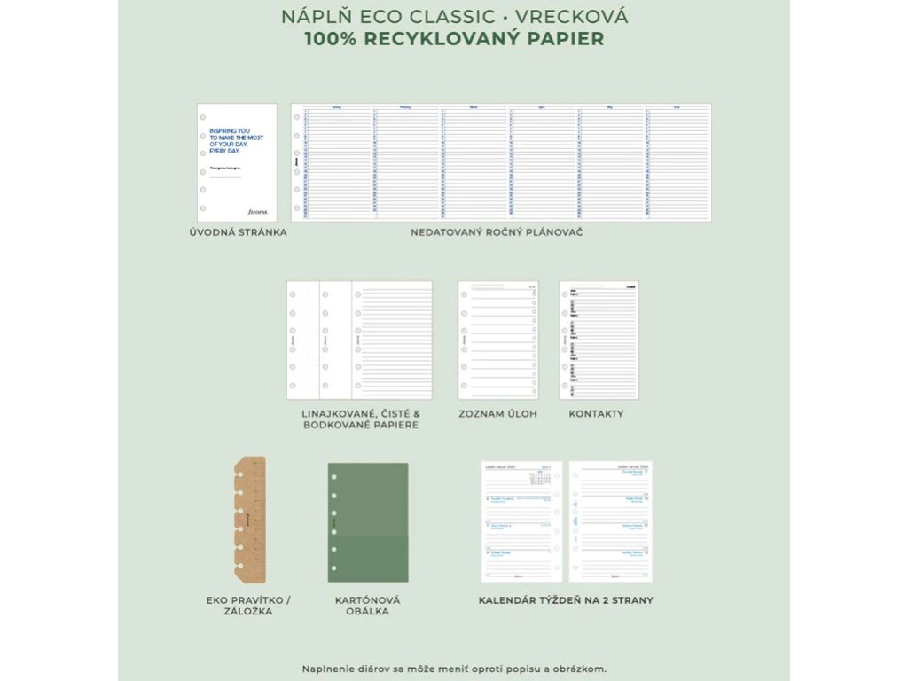 Tento udržateľný diár má dosky z vegánskeho materiálu zo 100% celulózových vlákien a Eco náplň s kalendárom týždeň na 2 strany vytlačený sójovým atramentom na recyklovanom papieri s certifikáciou FSC.