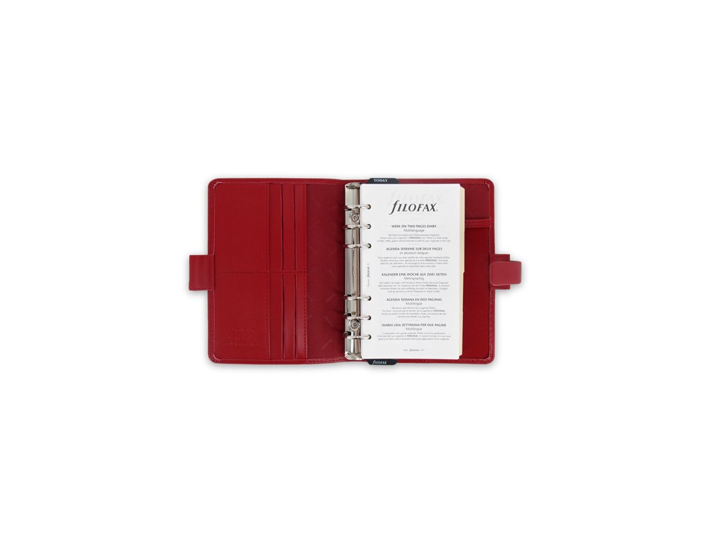 Diář osobní, vyhotovený ze syntetické kůže. S 6-kroužkovou mechanikou průměru 23mm. Diář obsahuje dvoustránkový týdenní kalendář linkovaný se svátky, v SJ i ČJ, pravítko / záložku, okrajové výřezy, bílý i barevný papír a adresář. Levá vnitřní strana desek je vybavena 4 vertikálními přihrádkami na kreditní karty, 2 vertikálními přihrádkami, pod nimi se nachází otevřená vertikální přihrádka po celé délce diáře. Samozřejmostí je poutko na pero. Pravá vnitřní strana desek obsahuje vodorovnou přihrádDoplňkové parametry