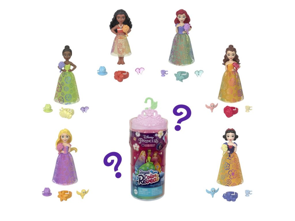 Tyto malé panenky s motivem zahradní party nabízí vzrušující zážitek při rozbalování díky technologii změny barvy Color Reveal™ a nečekanému počtu doplňků. Každé balení obsahuje malou panenku s překvapením Color Reveal™, například Ariel, Bellu, Vaianu, Lociku, Sněhurku a Tianu, u nichž přidání vody odhalí vzhled dané princezny. Překvapení zahrnují duhovou sukni z měkkého materiálu, doplňky na zahradní party, prsten a čelenku pro holčičku a víko, které slouží jako stůl na party.Doplňkové parametry