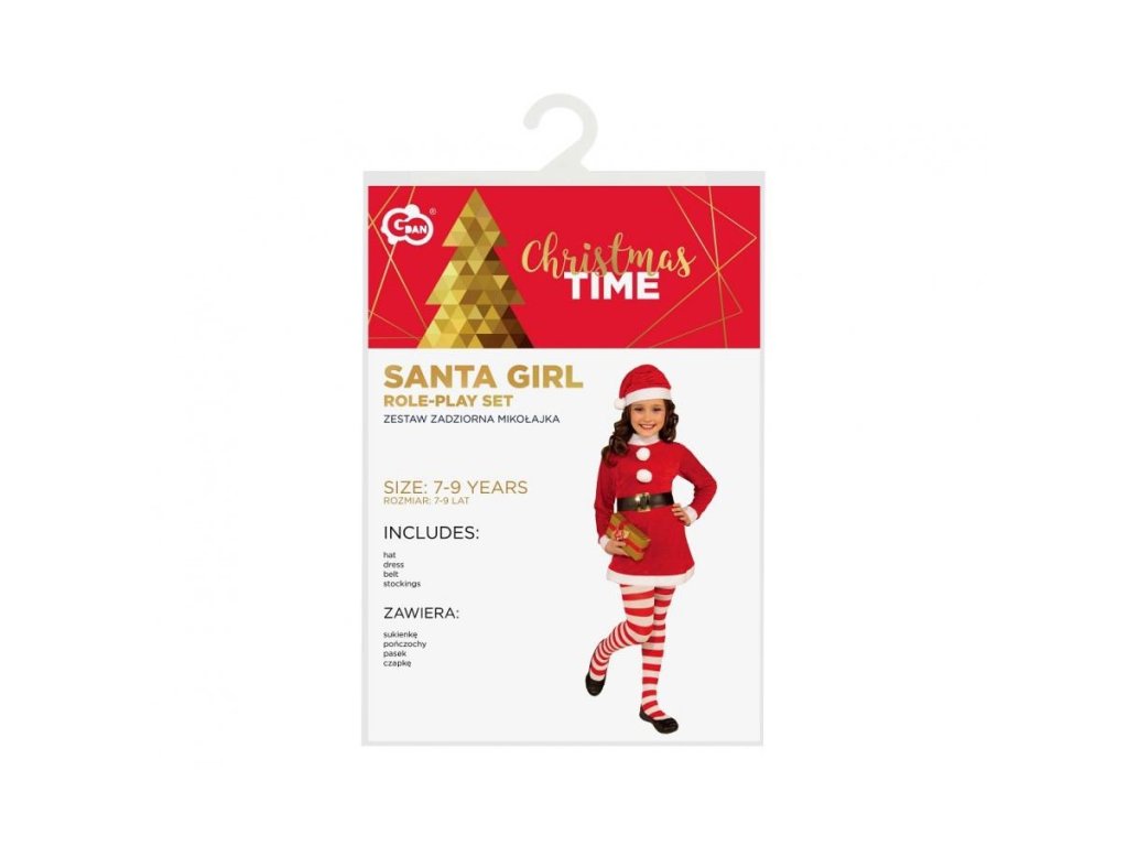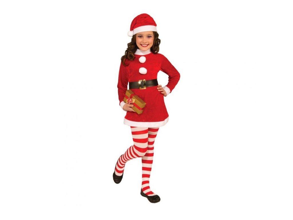 Dívčí mikulášská souprava (klobouček, šaty, opasek, punčochy), velikost 7-9 let Velikost: 7 - 9 let Celková délka: 79 cm Šířka v podpaží: 46 cm Délka rukávu: 49 cm Šířka v pase: 42 cm Šířka boků: 45 cm Materiál: 100% polyester.Doplňkové parametry