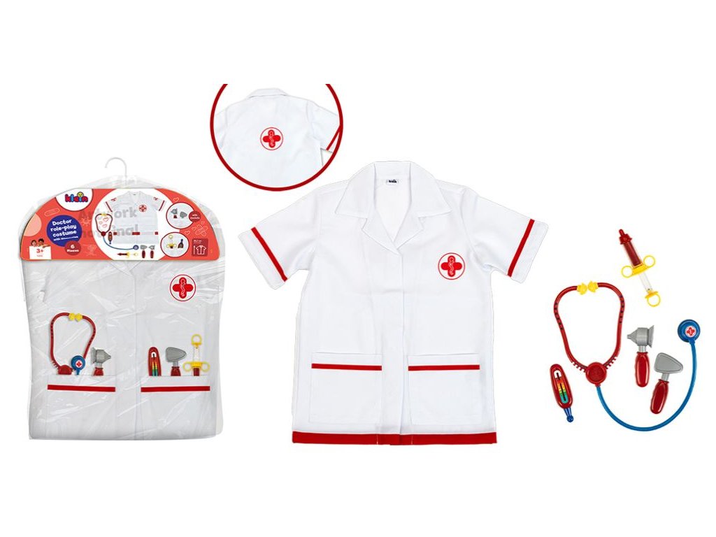 Doktorský oblek s doplňky, který nesmí chybět žádnému doktorovi! Obsahuje stetoskop, injekci, otoskop, tlakoměr, kladívko, teploměr a 1 plášť o rozměrech 60x40 cm. Vhodné pro děti od 3 let.Doplňkové parametry
