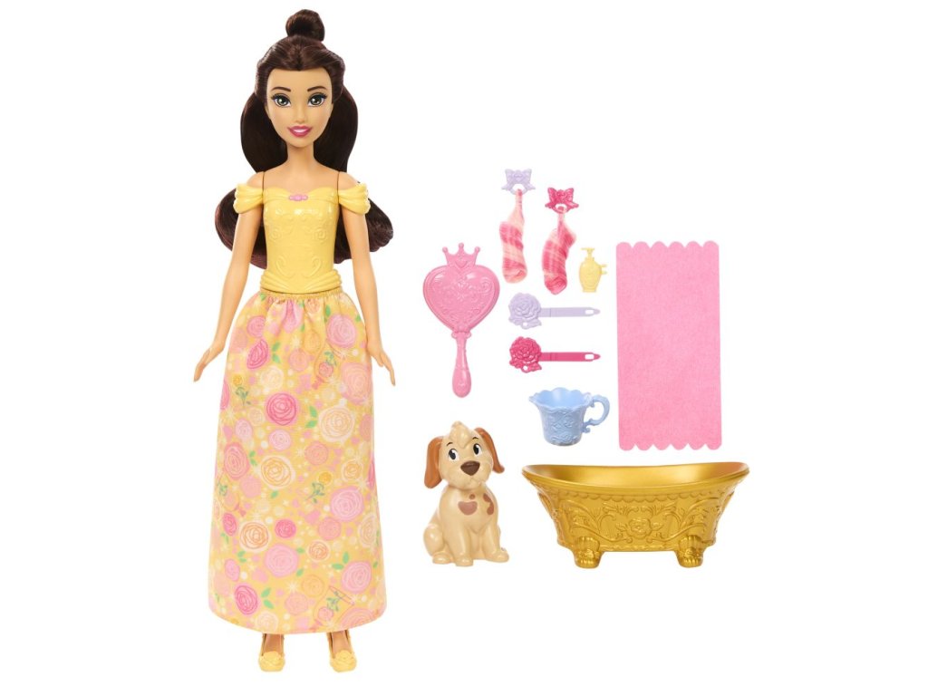 Tento roztomilý set přináší spoustu zábavy při koupání s princeznou Bellou a jejím roztomilým pejskem Sultanem. Děti mohou Belle pomoci s péčí o jejího mazlíčka pomocí vaničky a tematických doplňků - pro hraní plné fantazie. Přidejte vodu a sledujte, jak pejsek změní barvu. Kouzelná proměna je na světě! Panenka Bella má plastový živůtek, měkkou sukýnku, ladící korunku a boty – připravená na každé princeznovské dobrodružství! Panenka neumí samostatně stát. Barvy a vzhled výrobku se mohou lišit.Doplňkové parametry