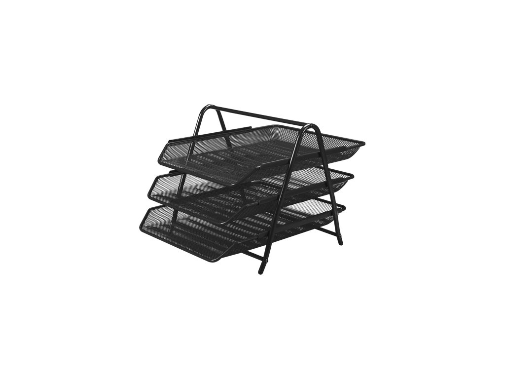 Drátěný stojan černý s třemi zásuvkami na dokumenty formátu A4. Zásuvky jsou vysouvatelné. Praktický a jednoduchý doplněk každého psacího stolu nebo kanceláře. Rozměr 270x350x260 mm.Doplňkové parametry