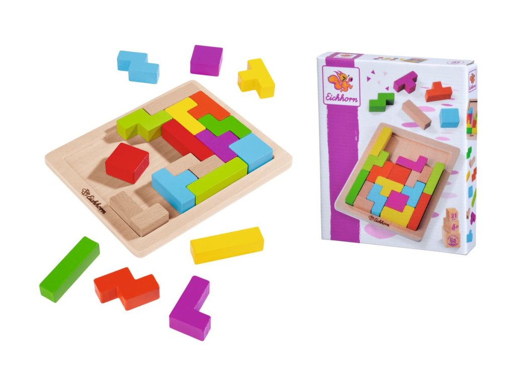 Dovednostní hra pro 1 hráče, 20 ks barevných různě tvarovaných kostek z bukového dřeva na desce z překližky, 5 tvarů kostek, rozměry: 18 x 15 cm.Doplňkové parametry