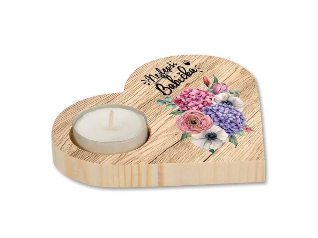 Dřevěný dekorační svícen "Nejlepší babička". Milý, drobný dárek, který jistě potěší každou babičku.Materiál: dřevo. Rozměry dřevěného srdce: šířka 12 cm – tloušťka materiálu je 1 cm, hmotnost 100 g. Svíčka je součástí balení.Doplňkové parametry