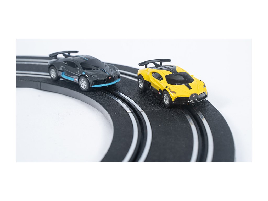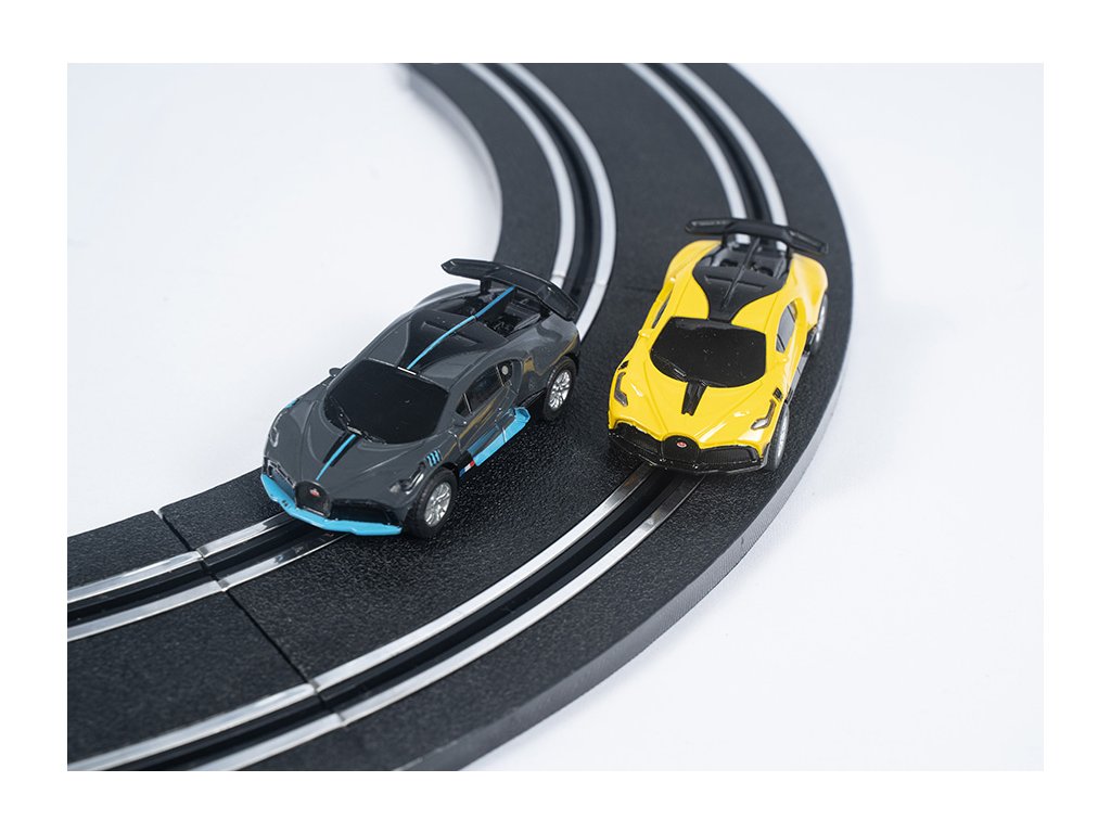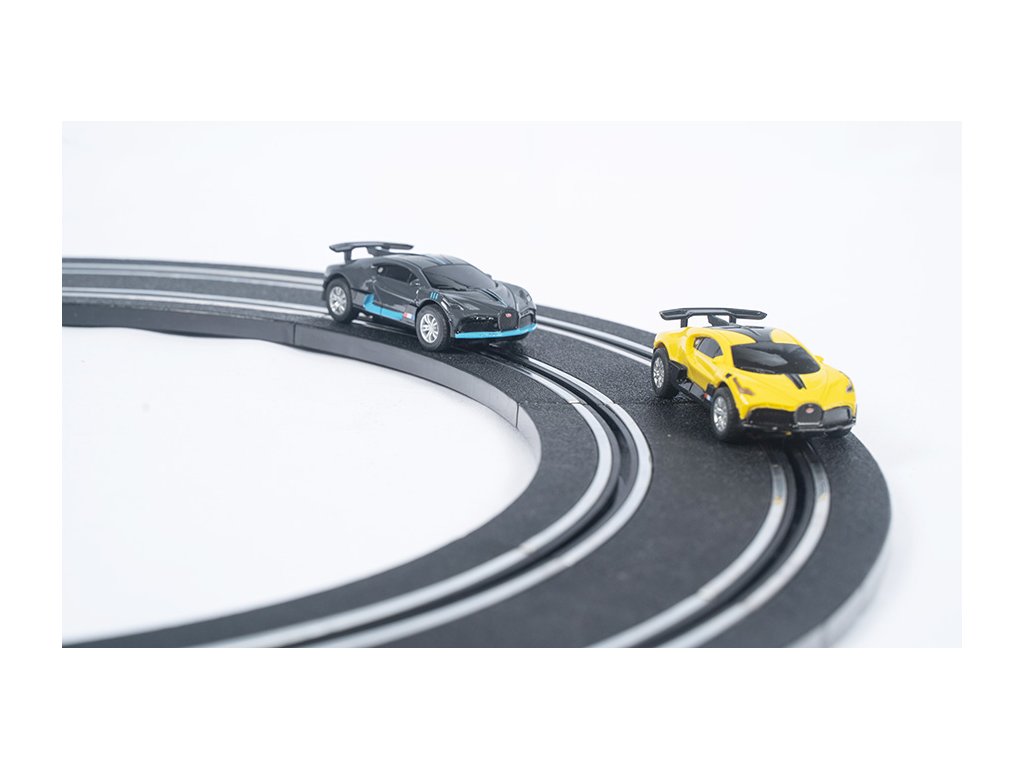 8,04 m dlohá autodráha na trafo. 3 různé druhy složení, 2 licenční autíčka Bugatti.Doplňkové parametry