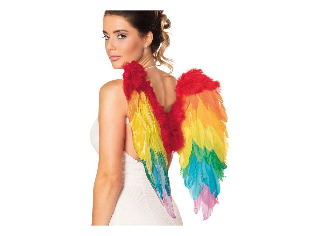 Andělská péřová křídla v duhových barvách. Křídla mají gumičku, kterou si je uchytíte za ramena. Materiál: 60% papír, 15% peří, 13% železo, 12% polyester Rozměr: 50 x 50 cmDoplňkové parametry