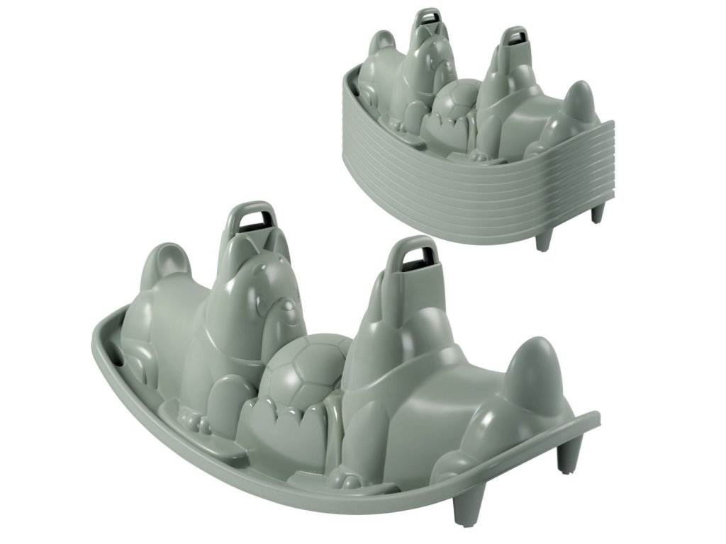 Dvojitá houpačka s ergonomickými sedátky ve tvaru pejska v zelenošedé barvě. Dvě držátka pro bezpečné použití. Plastové díly jsou ošetřeny anti-UV, což zajišťuje dobrou odolnost a stálost barev v průběhu času. Tento výrobek obsahuje minimálně 96% recyklovaného materiálu.Doplňkové parametry