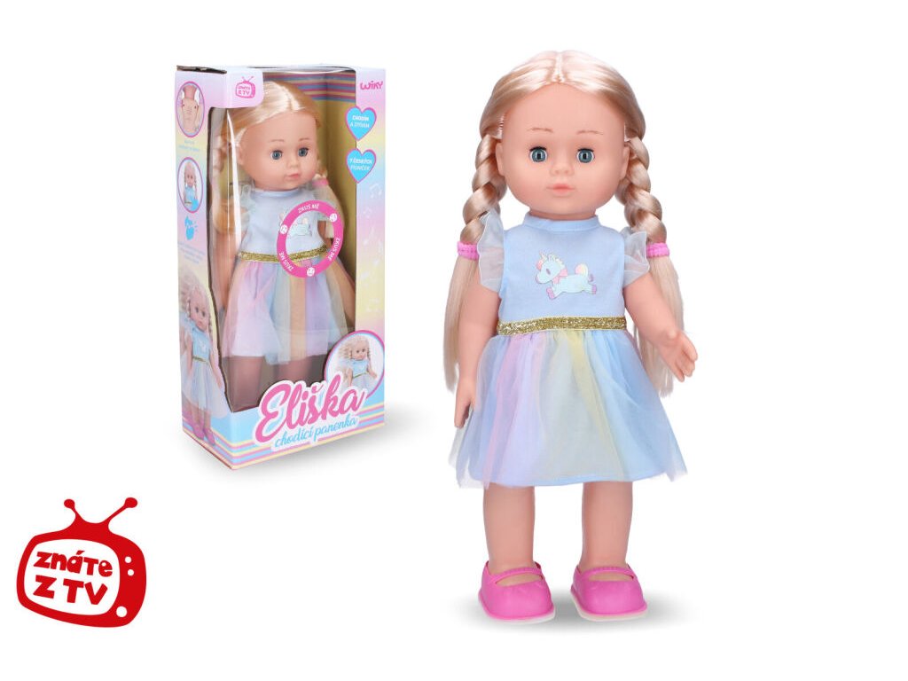 Začni den se svou nejlepší kamarádkou Eliškou. Eliška také ráda chodí a tančí. Vezmeš ji na procházku? Panenku Elišku si zamiluješ! Čeká vás spousta hraní a zábavy! Eliška je chodící panenka, která mooc ráda zpívá! Chceš si s ní zazpívat? Umí 7 lidových písniček. Stačí tlesknout a přidej se! Travička zelená Kočka leze dírou Červený šátečku Prší prší Já do lesa nepojedu Holka modrooká Kalamajka. Velikost: 41 cm. Doporučený věk: od 3 let. Panenku je možno spustit ve dvou režimech (Try me/ON). V režimu Try me jen zpívá, nechodí. Přepínání na zádech. Baterie: 3x AA součástí.Doplňkové parametry