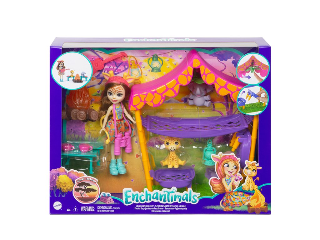 Prozkoumejte Sunny Savanna ™ se žirafou Griselda Giraffe ™ a jejími zvířecími nejlepšími kamarády! Tento herní set Enchantimals Savannah Sleepover ™ je plný her na vyprávění příběhů. Shromážděte se na lavičkách a usedněte u táboráku pro speciální čas sbližování Enchantimals ™ pomocí zábavného příslušenství, jako je kytara, hrnky, lucerny a další. Pak jděte do stanu pro sladké sny Savany! Pod „listovým“ stropním ventilátorem, který se točí, je houpací síť pro žirafu Griseldu, plus 2 postele pro žirafu se jménem Antenna ™ a slona se jménem Stompah ™! Malé děti si budou rády hrát na speciální pouto, které sdílejí přátelé Enchantimals ™! Barvy a dekorace se mohou lišit.Doplňkové parametry