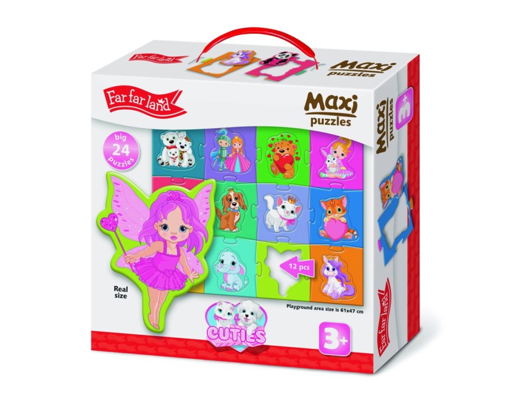 Far Far Land Maxi Puzzle roztomilé postavičky. Balení obsahuje 24 dílků (12 puzzle dílků + 12 dílků s postavičkami). Složené 61x47 cm.Doplňkové parametry