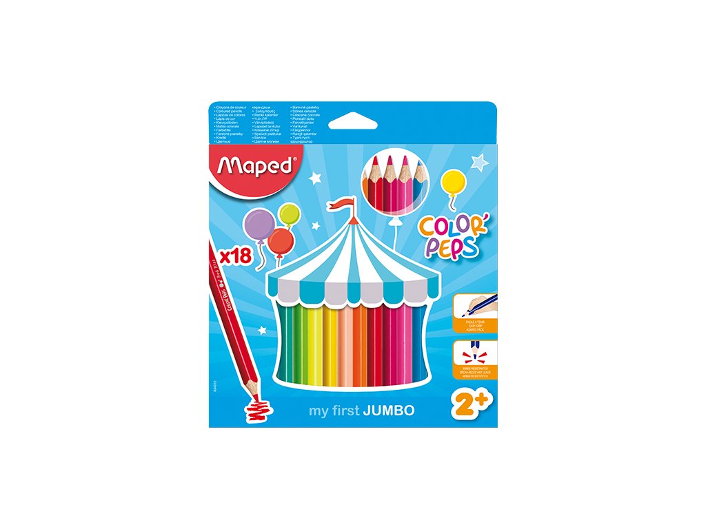 Pastelky Maped Color'Peps JUMBO určeny díky hrubému tělu i pro ty nejmenší. • trojhranné tělo pro pohodlný úchop • jasné a syté barvy • odolné jádro pastelky • tloušťka tuhy: 4.7 mm • 18 pastelek v balení • trojhranné pastelky pohodlně ostruhu klasickým struhadlemDoplňkové parametry