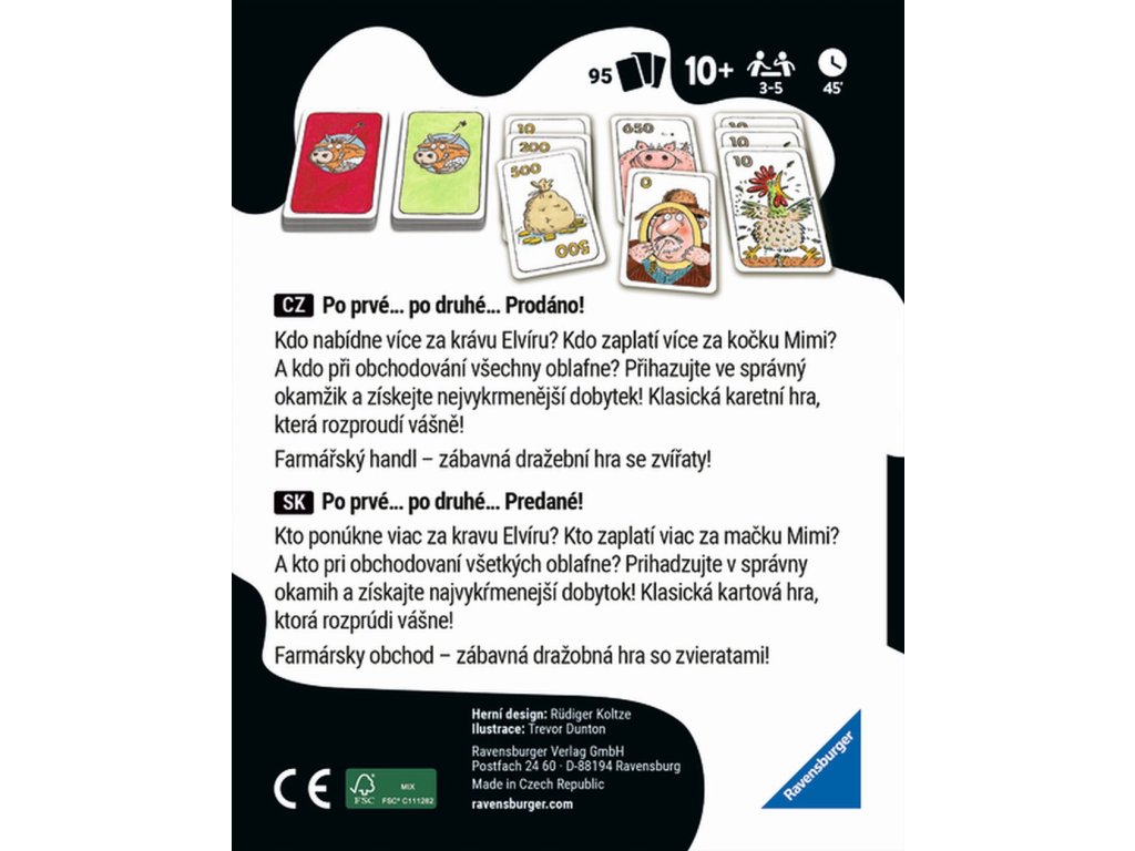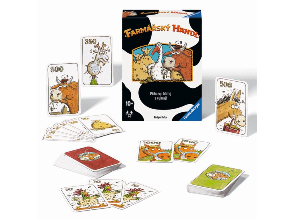 Po prvé ... po druhé ... Prodáno! Kdo nabídne více za krávu Elvíru? A kdo při obchodování všechny oblafne? Přihazujte ve správný okamžik a získejte nejvykrmenější dobytek! Farmářský handl - zábavná dražební hra se zvířaty! Každý hráč se snaží v dražbě získat co nejvíce zvířecích kvartet s co nejvyšší hodnotou. Vítězem se stává ten, kdo získá nejvíce bodů. Peníze nemají na konci žádnou cenu. Obsahuje: 40 karet zvířat, 55 karet peněz, pravidla hryDoplňkové parametry