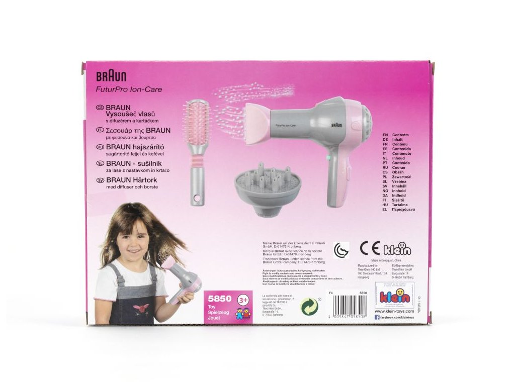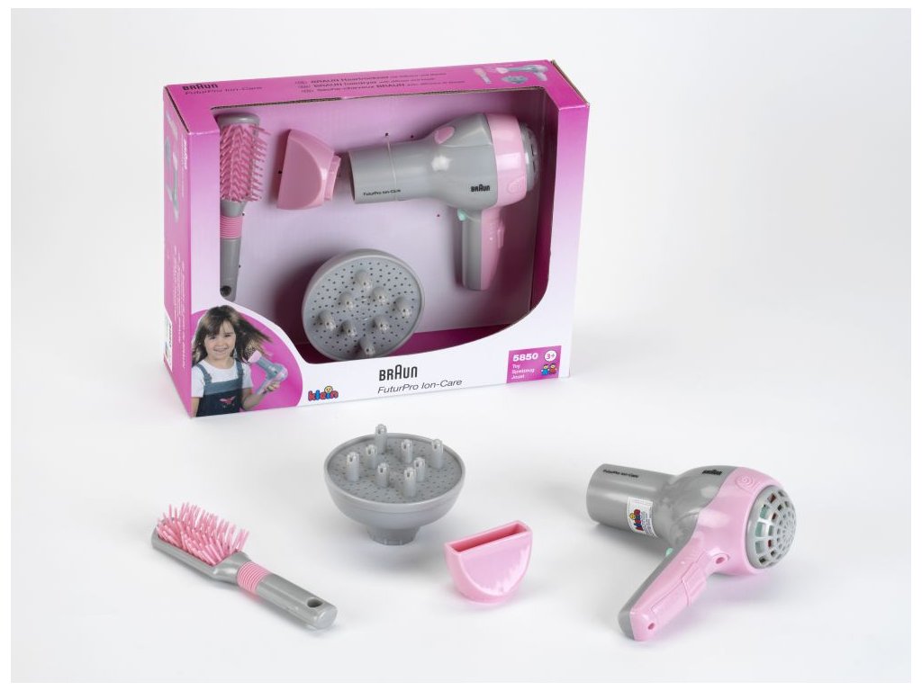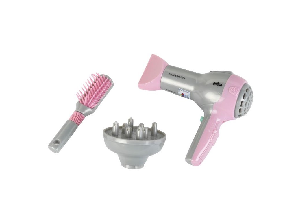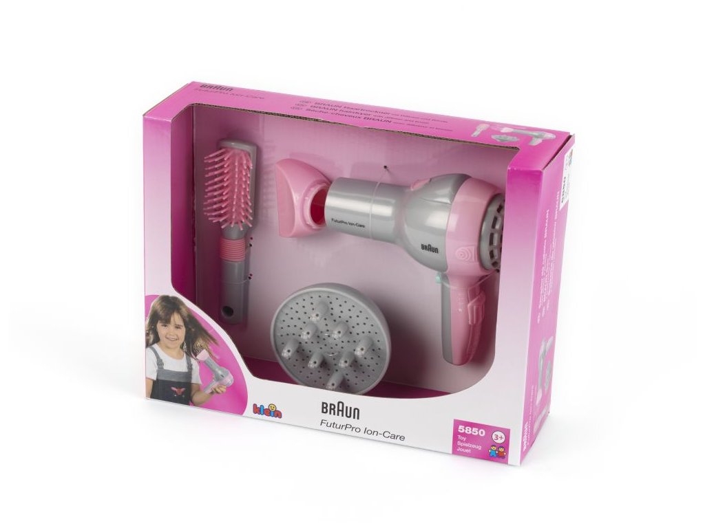 Funkční dětský fén značky Braun s doplňky. Fouká. Baterie 1 x AA, nejsou součástí balení.Doplňkové parametry