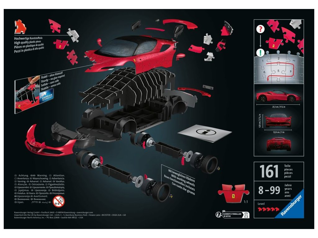 Zažijte jedinečnou kombinaci skládání a stavění a vytvořte si působivý model jednoho z nejikoničtějších vozů Ferrari SF 90 Stradale v nepřehlédnutelné červené barvě ze 108 dílků. Kvalitní, plastové puzzle s technologií Easyclick. Bez nutnosti lepení! S funkčními otáčecími koly. Puzzle obsahuje pevnou vnitřní konstrukci pro zajištění maximální stability složeného modelu.Doplňkové parametry