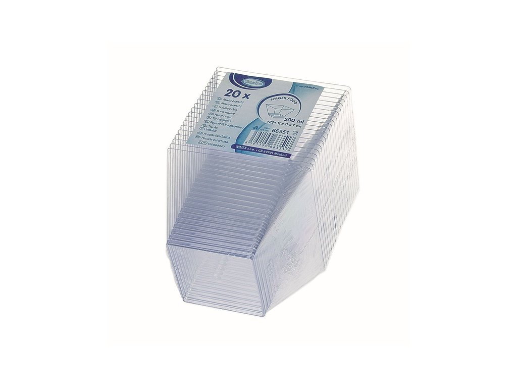 Kvalitní designová miska o objemu 500 ml vhodná na dezerty a saláty, Vaše chuťovky se budou krásně vyjímat na fingerfood miskách. Miska je vyrobena z velmi pevného materiálu krystal PS: materiál dokonale imitující sklo, vyznačuje se vysokým leskem a průhledností. Rozměry: hrdlo 110 x 110 mm (dno 65 x 65 mm), výška 70 mm. Vhodná pro použití do 100°C. Sada obsahuje 20 ks. Nabízíme Vám také víčko pro Fingerfood skleničku, kód: 66330.Doplňkové parametry