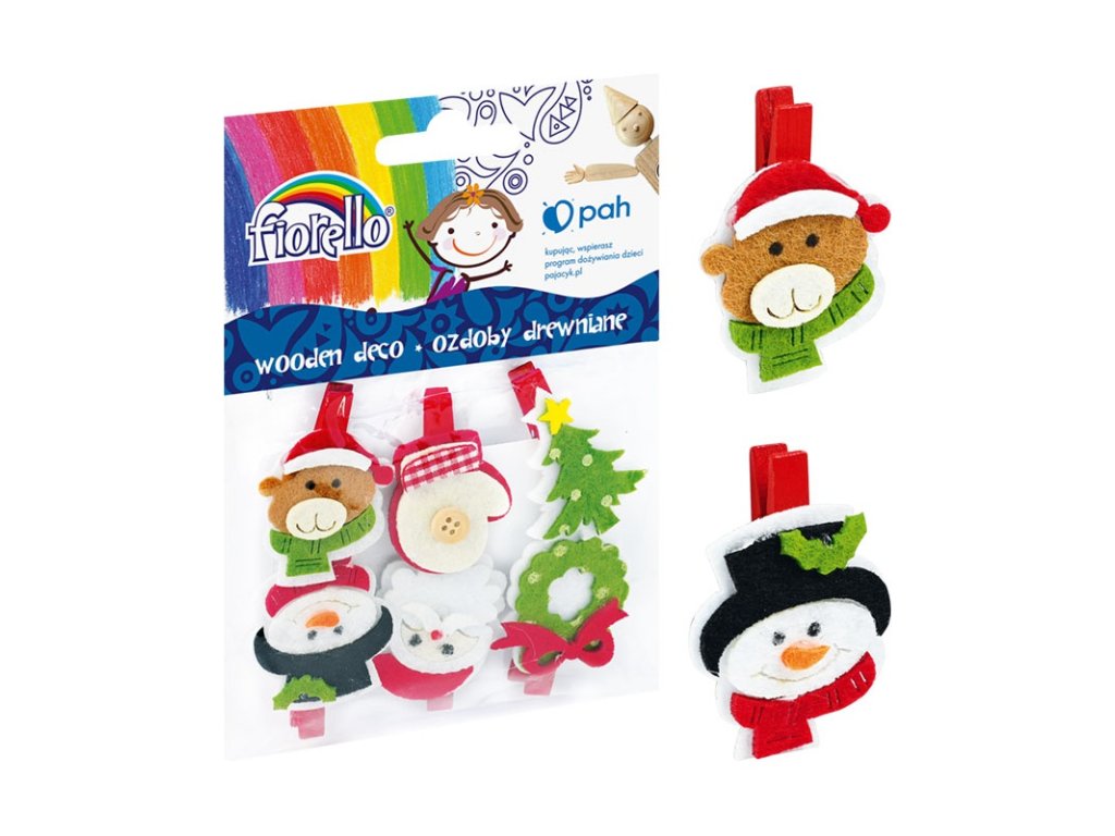 Sada Fiorello GR-WD449 obsahuje šest dřevěných vánočních ozdob s filcovými motivy. Každá ozdoba je připevněna na pevném klipsu, takže se dá jednoduše uchytit na dárky, dekorace nebo větvičky. Jedná se o veselý doplněk vhodný pro tvůrčí aktivity i sváteční zdobení.