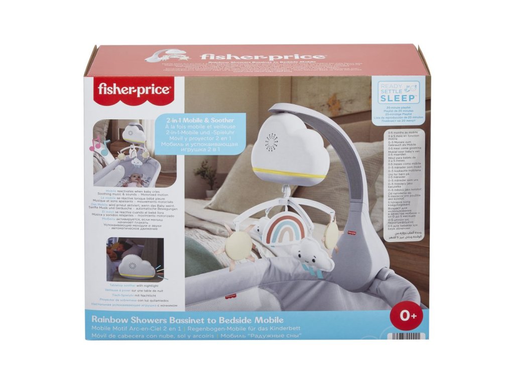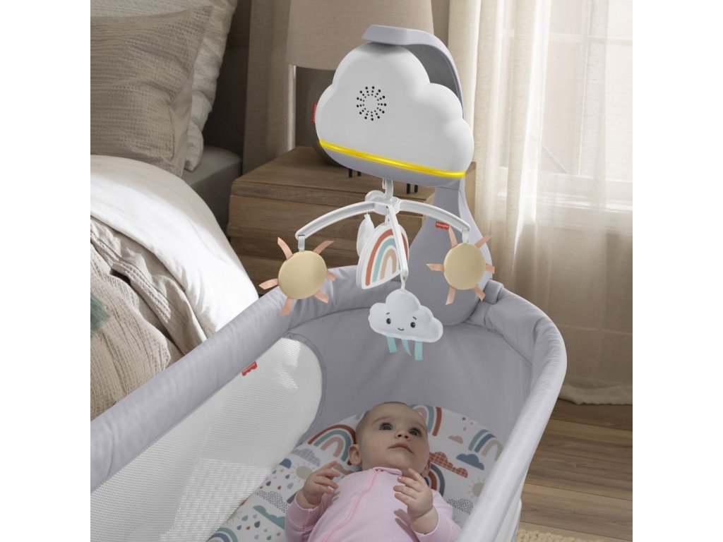 Fisher-Price® Kolotoč nad postýlku déšť s duhou má oslnivé závěsné hračky v podobě obláčků a sluníček a obsahuje 20minutovou melodii, která pomůže vašemu novorozenci uvolnit se a usnout. Praktický snímač pláče automaticky spustí uklidňující hudbu a kolotoč, když děťátko vydá zvuk! A když děti povyrostou, odejměte obláček z kolotoče a vytvořte z něj uspávací hračku na noční stolek. Vhodné pro většinu dětských postýlek, kolébek a přenosných ohrádek. Není určeno pro použití na ohrádky se stříškou nebo postýlky se stříškou. Určené na použití na postýlky od narození do 5 měsíců a na noční stolek od 5 měsíců.Doplňkové parametry