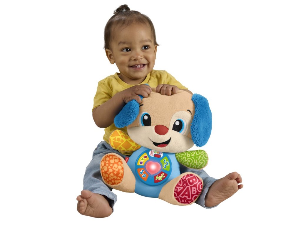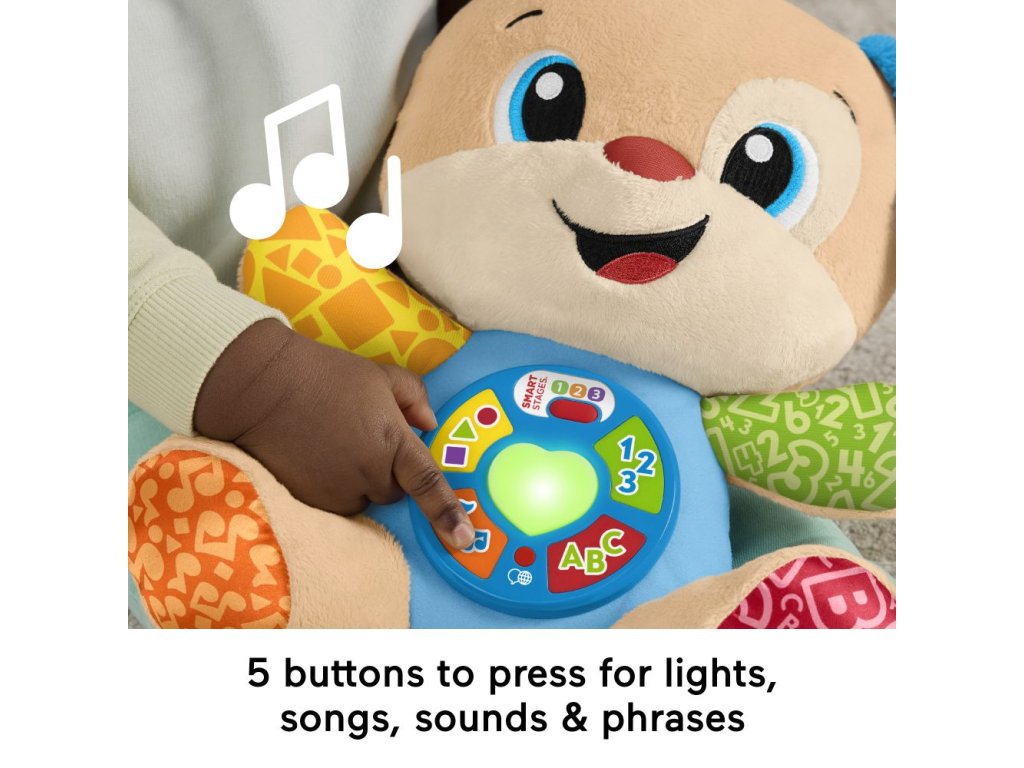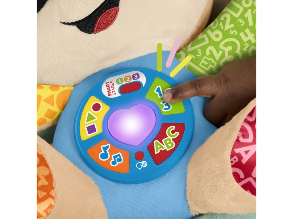 Mluvící pejsek Smart Stages® z řady Fisher-Price® Směj se a Poznávej!® je příjemná plyšová hudební hračka, která seznamuje děťátko s abecedou, tvary, prvními slovy a dalšími prvky! Děti mohou stisknout 5 tlačítek na bříšku pejska a sledovat, jak se jeho srdíčko rozsvěcuje různými barvami, zatímco hraje více než 80 písniček, zvuků a frází. Díky více než 12 originálním písničkám a 3 úrovním učení Smart Stages®, které rostou spolu s dítětem od kojence až po batole, se Mluvící pejsek jistě stane nejlepším kamarádem vašeho děťátka.Doplňkové parametry