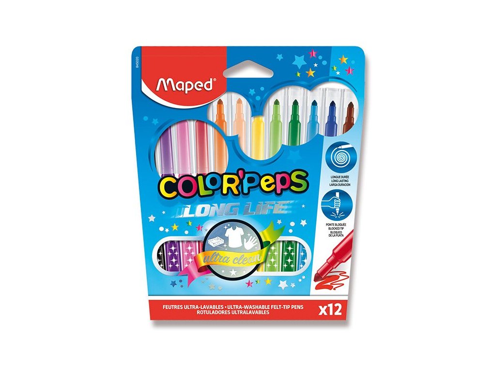 Souprava barevných fixů se snadno vypratelným a omyvatelným inkoustem. Zářivé barvy. Hrot odolný proti zatlačení či poškození, účinný uzávěr. Dlouhá životnost. Trojúhelníkový úchop pro lepší a pohodlnější držení. Přednosti barevných fixů Maped ColorPeps: bezpečnost - prodyšný uzávěrstřední hrot - seříznutý hrot pro tenkou a širokou linkuodolnost - hrot odolný proti zatlačení či poškozeníergonomický tvar - trojhranný tvar pro lepší uchopení a pohodlnější používánívypratelné - inkoust ultra snadno vypratelný z většiny textilií a lehce omyvatelnýzářivé barvyDoplňkové parametry