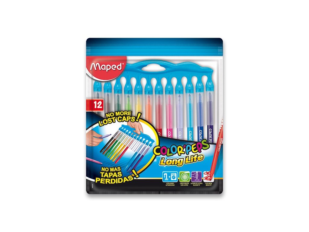 Souprava 12 barevných fixů se snadno vypratelným a omyvatelným inkoustem. Zářivé barvy. Hrot odolný proti zatlačení či poškození, účinný uzávěr. Dlouhá životnost. Trojúhelníkový úchop pro lepší a pohodlnější držení. Patentovaný systém upevnění víček do praktického držáku. Šíře stopy: 3,6 mm Přednosti barevných fixů Maped ColorPeps bezpečnost - prodyšný uzávěr střední hrot - seříznutý hrot pro tenkou a širokou linku. - hrot odolný proti zatlačení či poškození ergonomický tvar - trojhranný tvar pro lepší uchopení a pohodlnější používání vypratelné - inkoust lehce odstranitelný z rukou i z většiny textilií zářivé barvy dlouhá životnostDoplňkové parametry