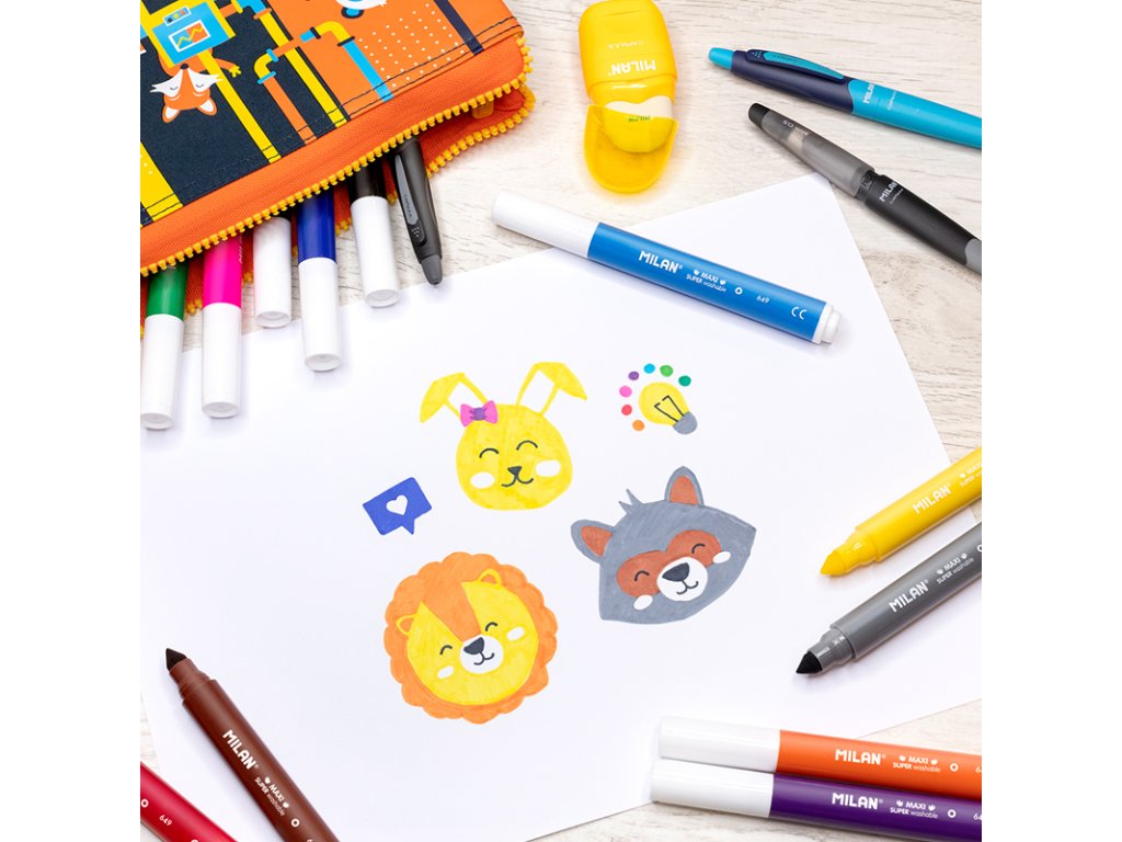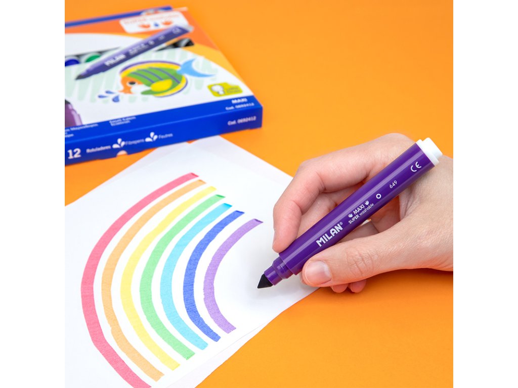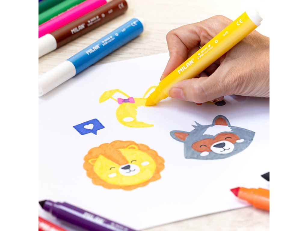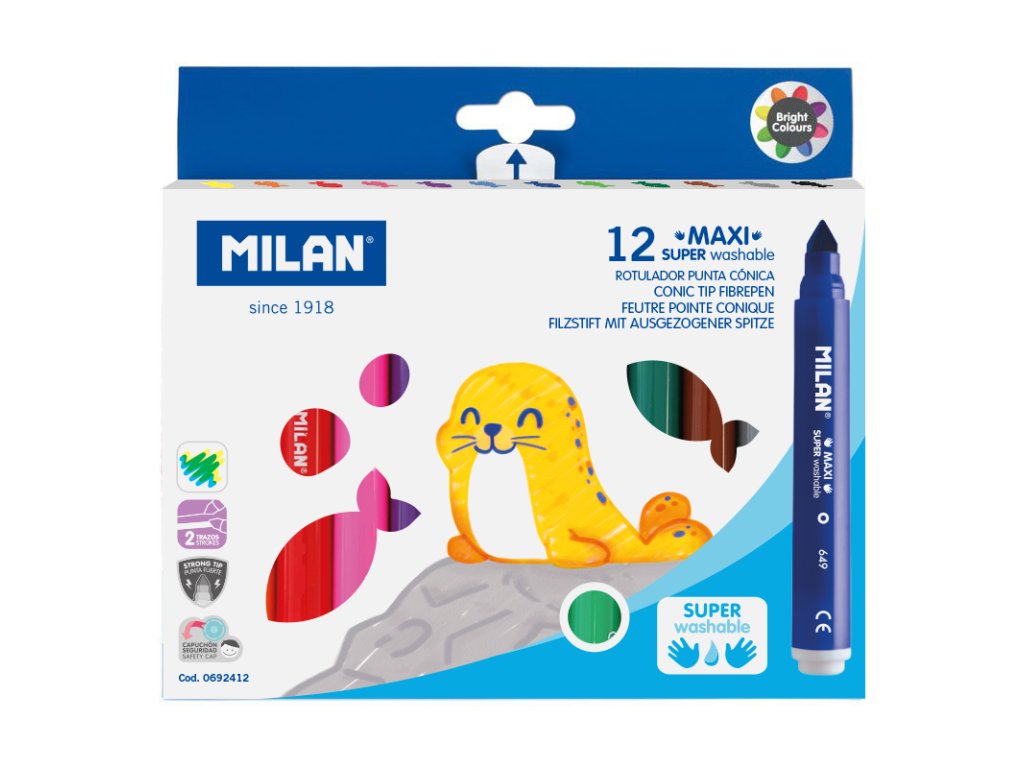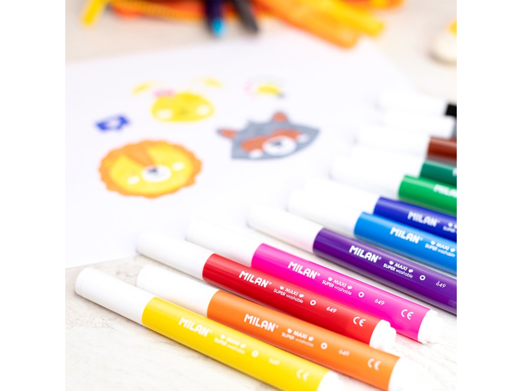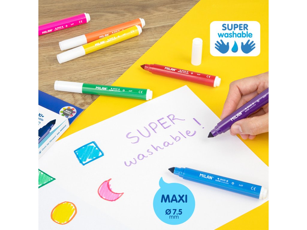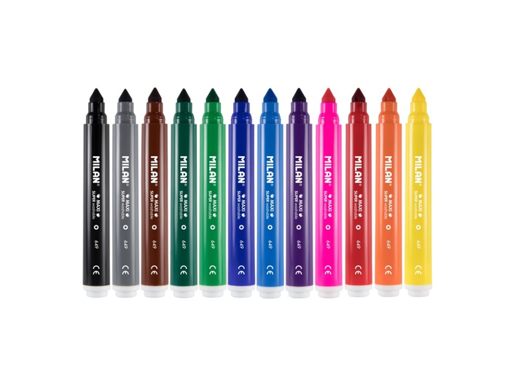 Fixy s kuželovou špičkou o průměru 7,5mm, která se dá použít na vytvoření tahů od 1mm do 3,25 mm. Velikost MAXI je ideální pro děti. Barvy jsou pratelné (namočit do studené vody na hodinu a potom umýt za studena). Inkoust na vodní bázi, který umoňuje lehDoplňkové parametry