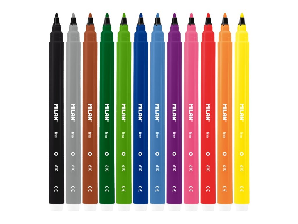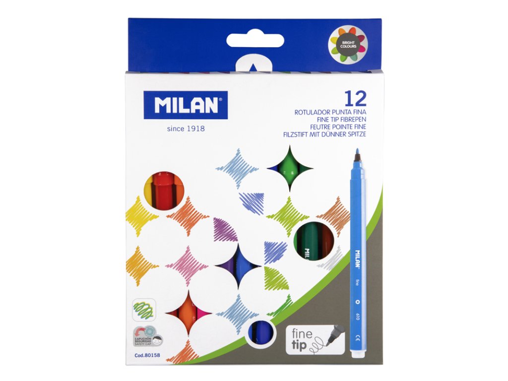Fix s kulatým hrotem MILAN fine s jemnou špičkou o průměru 2 mm. Obzvláště vhodná na kreslení obrysů a psaní jemnými tahy. Barva na vodní bázi, která vytváří jasné a snadno nanesitelné barvy, které se dají navzájem kombinovat. Dá se snadno vyprat z většiny látek. S perforovaným bezpečnostním uzávěrem. 12 barev.Doplňkové parametry