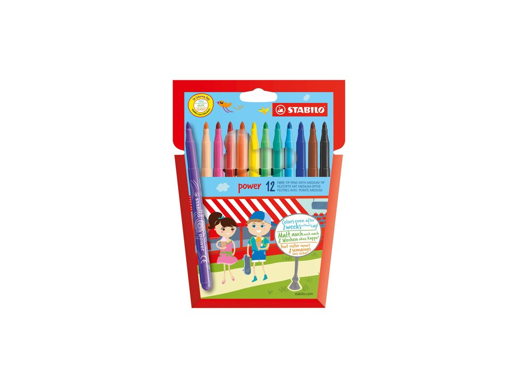 STABILO power 12 ks jsou ideální fixy pro děti, které čas od času zapomenou někde víčko. Fixy mají extrémně dlouhou životnost a vydrží až 8 týdnů bez víčka a nevyschnou. Jsou tedy ideálním řešením pro školky, školy či herny. Mají robustní hrot šířky M který je odolný tlaku. Náplň je vypratelná. Ideální pro malé umělce a jejich nádherné obrázky.Doplňkové parametry