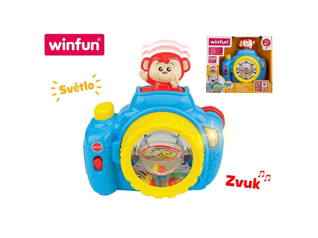 Vyskakovací opičí kamera je vyrobena výhradně z kvalitního plastu.Stiskněte opici rukou a uslyšíte zvuky vydávané tímto exotickým zvířetem. V čočce je chrastítko se včelou. Stisknutím žlutého tlačítka se včelí koule roztočí. Otočte okraj objektivu a umístěte jej, abyste pořídili dokonalou fotografii. Spustíte melodie, zvuk pořízeného obrázku, zvuky opice a světlo. Rozměry: 17,2 x 16,6 x 8,2 cm Hračka má vypínač a dva režimy hlasitosti. Vhodné pro děti od 9 měsíců.Doplňkové parametry