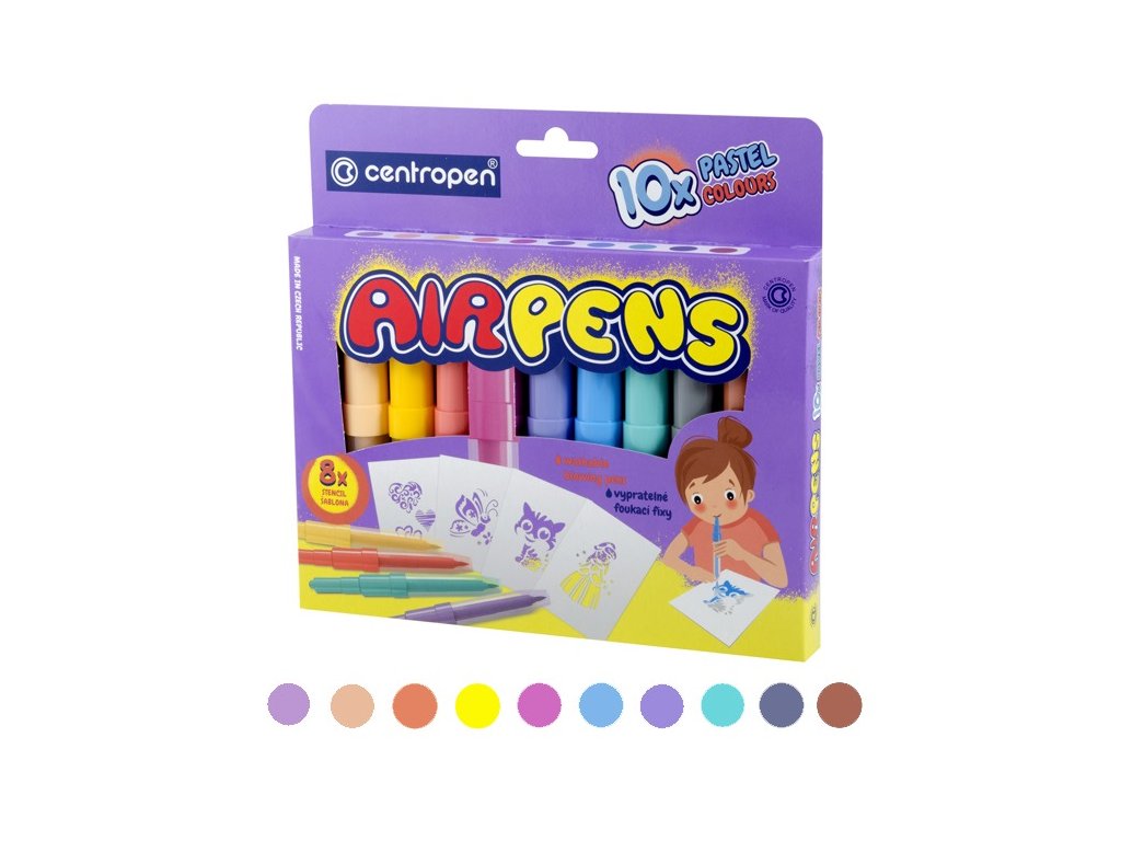 Foukací fixy Centropen 1500/10 Pastel- foukací fixy na papír- pastelové barvy- zdravotně nezávadný inkoust- snadno smyvatelné a vypratelné- 10 barevných odstínů- 8 šablon u baleníDoplňkové parametry