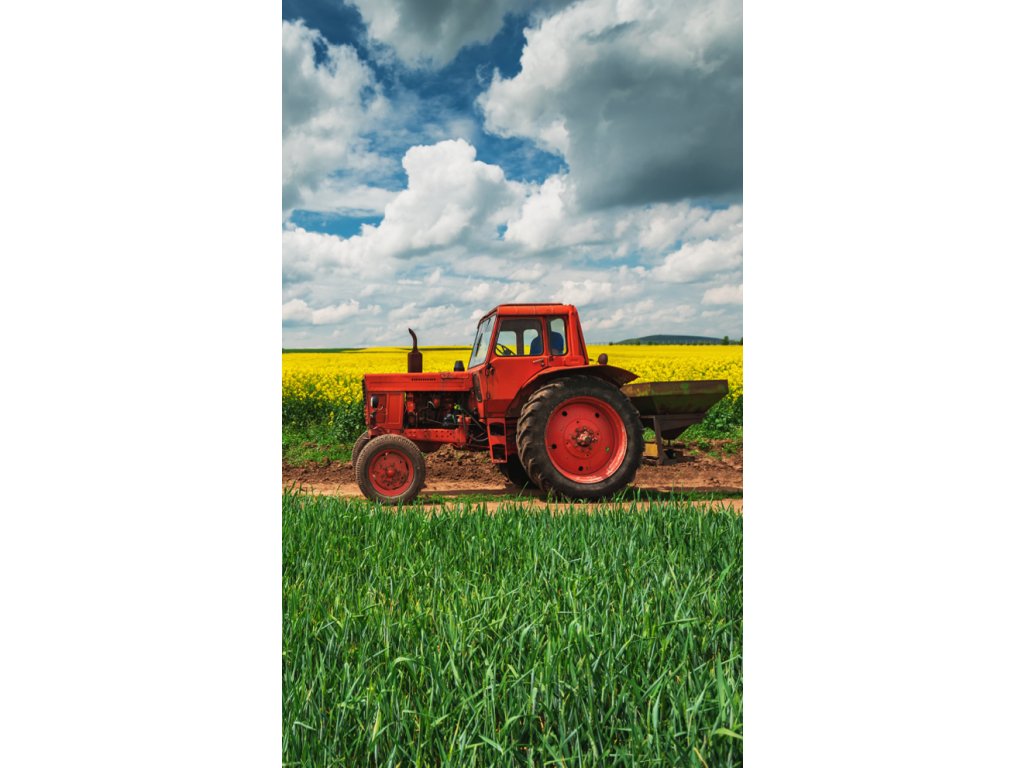 Na lícní straně froté ručníčku "pádí" přes pole červený traktor, který se chystá ke sklizni řepky olejnaté