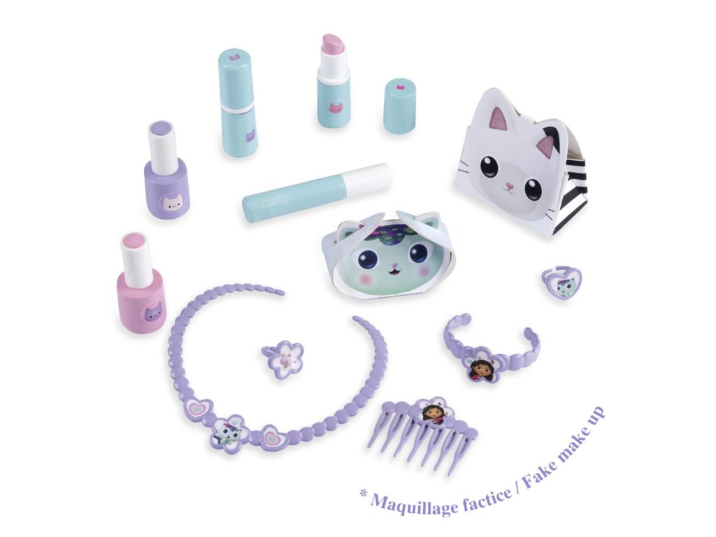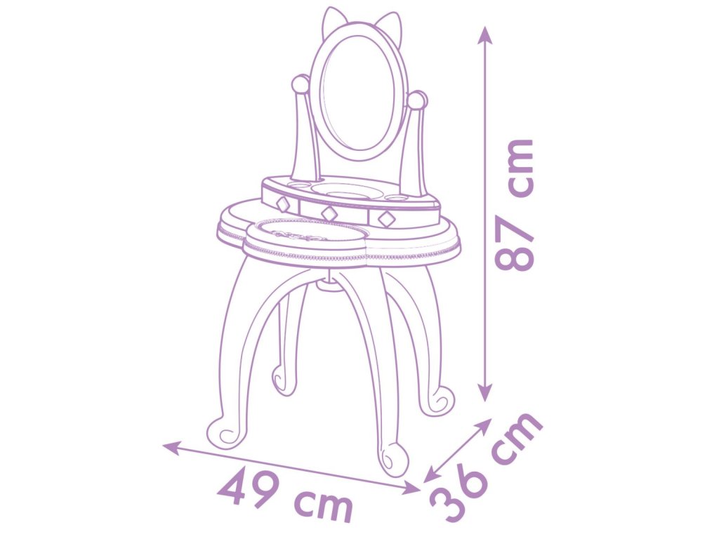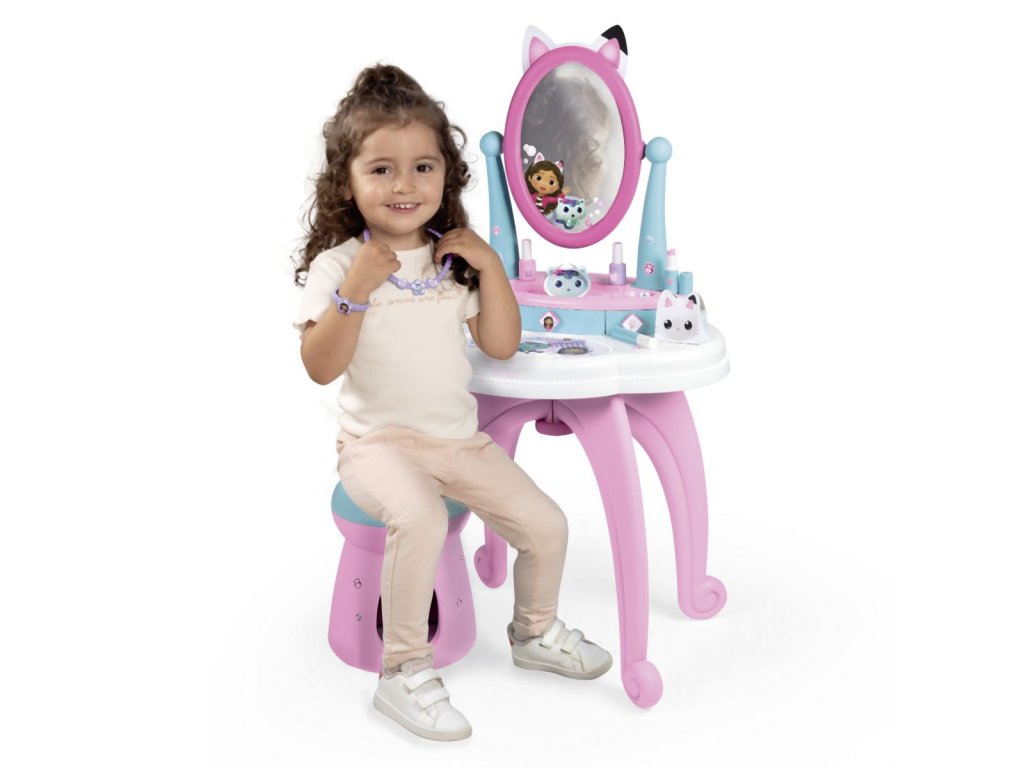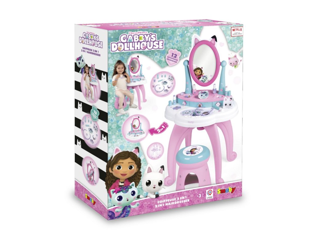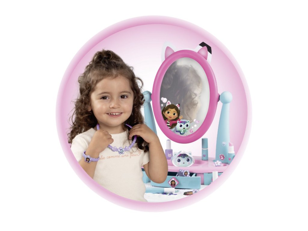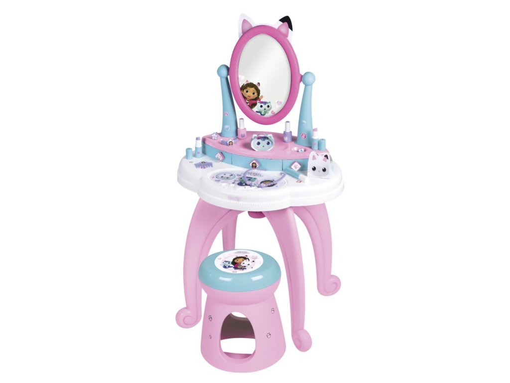 Toaletní stolek v designu Gabby´s Dollhouse se třpytivým efektem pro malé parádnice. Více než 10 ks příslušenství (např. čelenka, hřeben, prstýnky, lak na nehty, rtěnka atd.). Součástí nastavitelné zrcátko a židlička, nosnost židličky 50 kg. Toaletní stolek lze oddělit od nohou a postavit na stůl. Rozměry: 49 x 94 x 36 cm. Hmotnost 2,36 kg.Doplňkové parametry