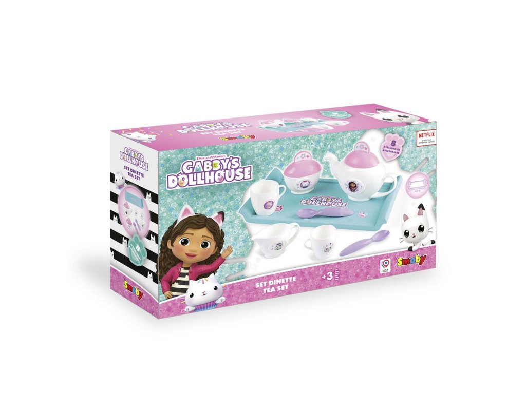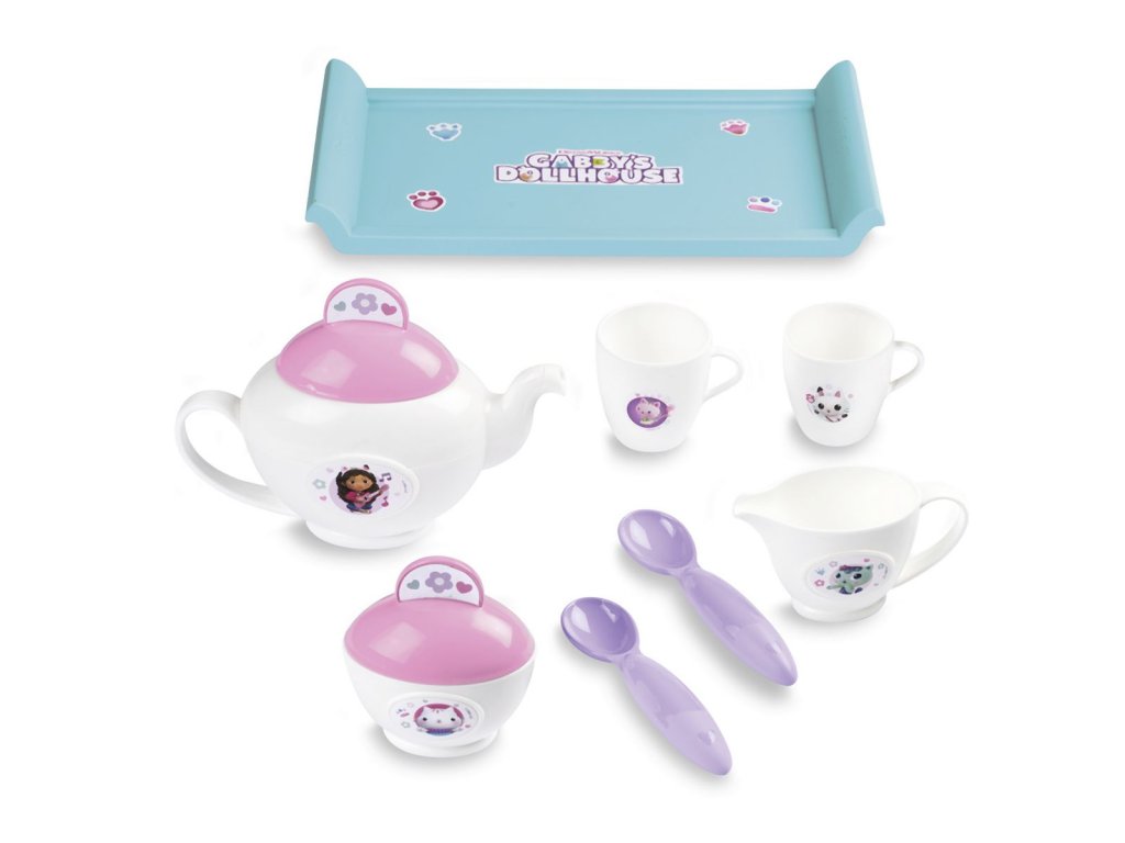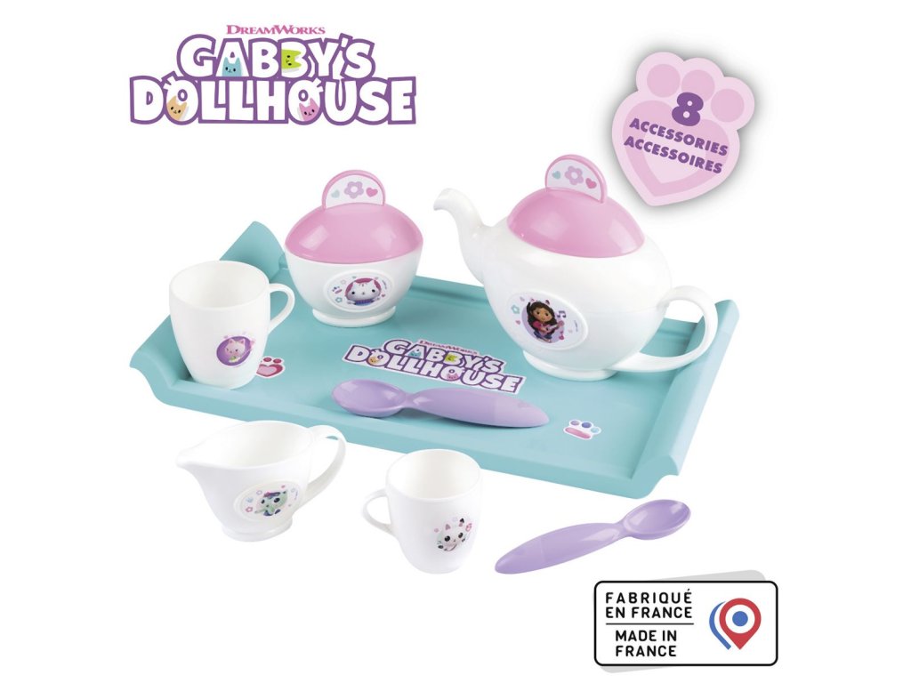 Souprava pro servírování čaje s tácem Gabby´s Dollhouse. Obsahuje 8 ks příslušenství: tác, 2 šálky, dvě lžíce, konvičku na čaj, cukřenku s pokličkou a konvičku na mléko. Rozměry tácu 26 x 14,2 x 2,6 cm. Hmotnost: 0,197 kg.Doplňkové parametry